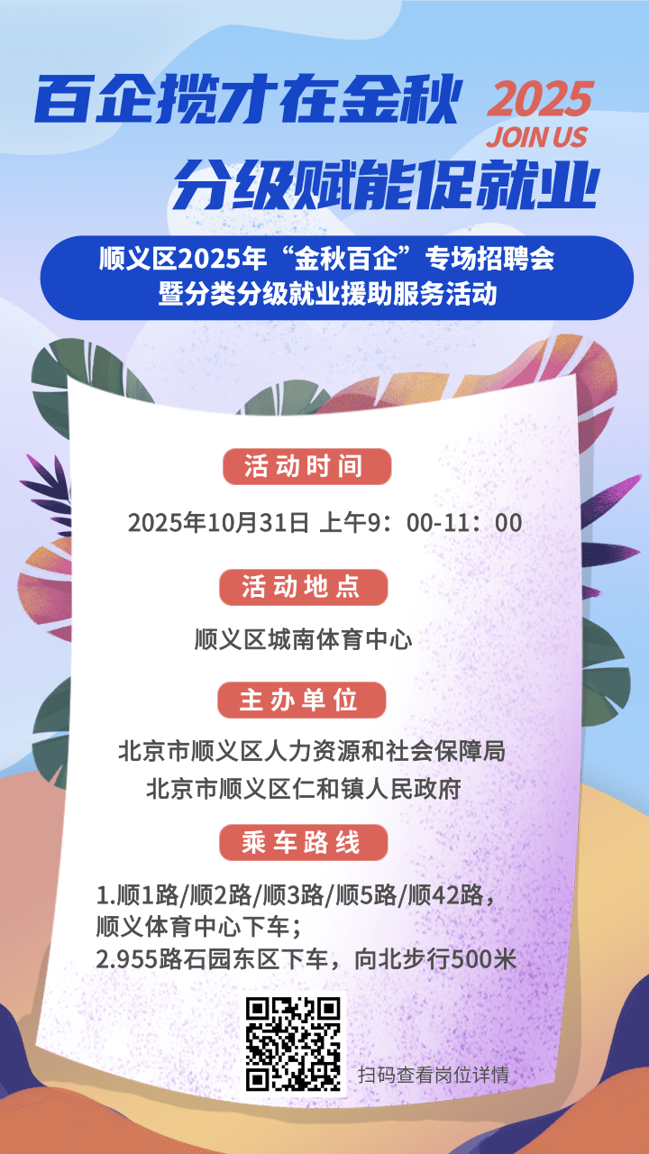 10月31日,顺义区人力资源和社会保障局携手顺义区仁和镇人民政府,联合举办“百企揽才在金秋 分级赋能促就业”大型招聘会,127家用人单位现场招聘,带来制造业、服务业等重点领域的就业岗位3100余个。届时,北京时间将现场直播,带你了解企业招聘需求,手把手教你如何投简历