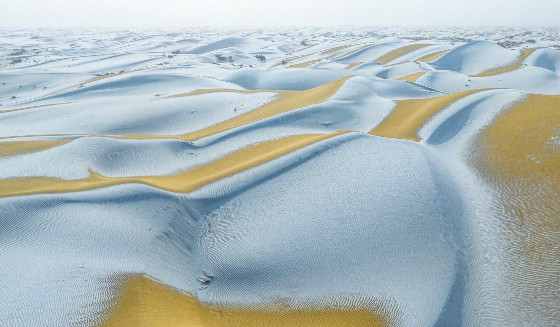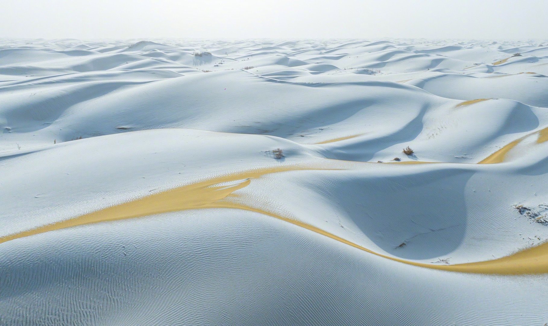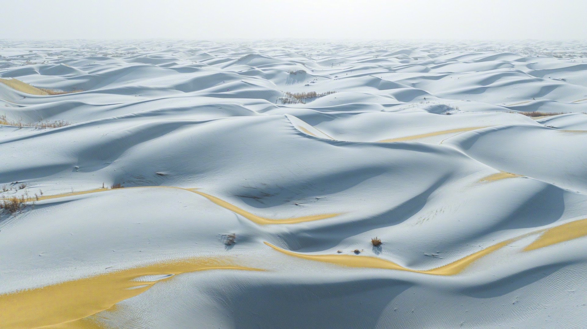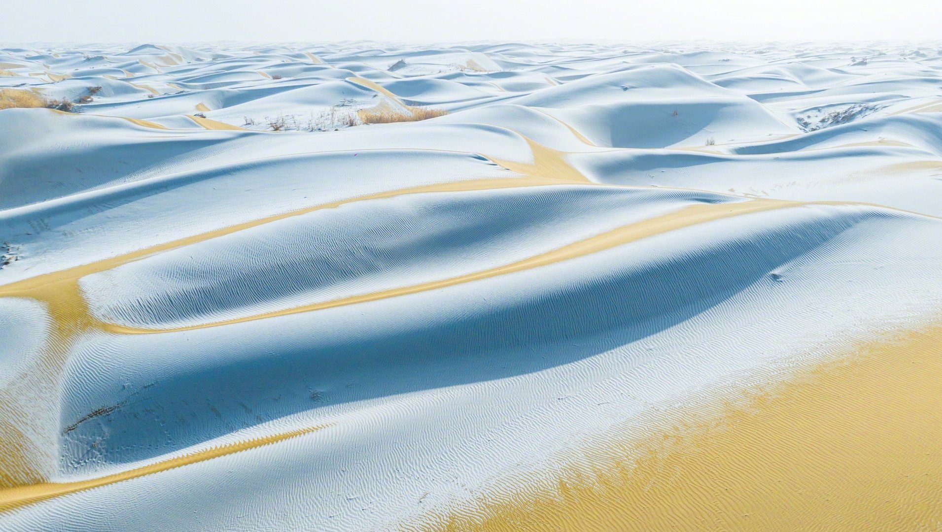 1月28日夜间至29日清晨,中国最大的流动沙漠塔克拉玛干出现降雪。1月28日夜间至29日清晨,中国最大的流动沙漠塔克拉玛干出现降雪。金黄与银白碰撞交融,沙漠雪景别有一番意境。