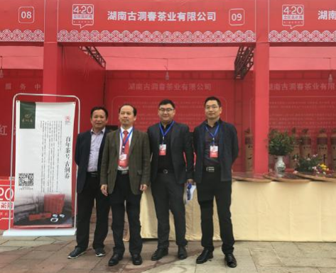 ▲桃源县常务副县长李宏秋(左二)与古洞春公司总经理卢振兴(左三)在古洞春茶业展位前合影 记者 刘玺东/摄