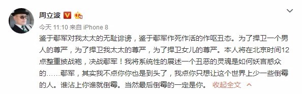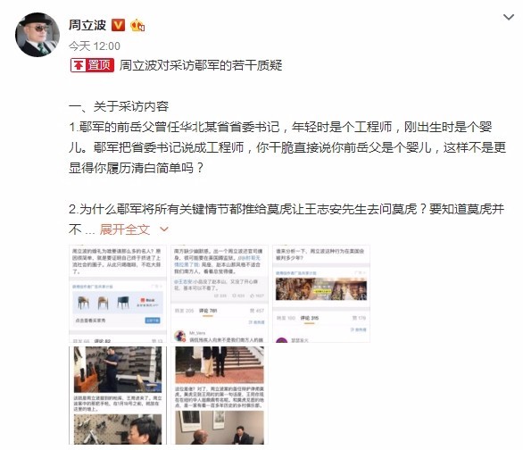 似乎在回应之前网络上盛传的涛涛军军浪漫爱情故事12点一到,很多群众迅速冲到前线准备吃瓜,可是却并没有看到周立波所谓的录音,只有一条置顶长微博在这条微博中,周立波表达了自己对于采访鄢军的若干质疑他颇为隐晦的表示了自己对于记者王志安的不满...