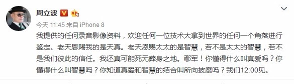 8月13日中午,周立波在微博上连发多条微博,表示自己将在今天中午12点公开自己太太胡洁和鄢军(即之前的“某某”)的对话录音,他称自己提供的“任何录音影像资料,欢迎任何一位技术大拿到世界的任何一个角落进行鉴定。”