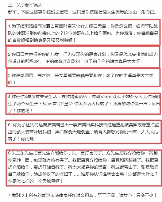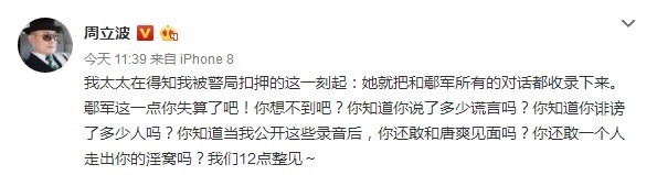 之后,周立波继续爆料了很多关于鄢军不为人所知的事:“为结束婚姻同时霸占巨额财富,设计让前妻出轨”;“同时让两个婚外恋女人为他生私生子”……