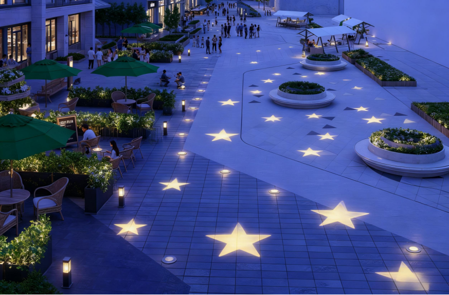 景观设计更是独具匠心,以“传承历史、彰显特色”为核心,复现蜿蜒河道水系,其形态参照青龙峡的弯曲意境,暗合“如意”吉祥寓意,象征怀柔文脉源远流长。同时,大幅提升街区绿化品质,增加乔木、灌木种植及移动绿植箱,打造层次丰富的立体绿化体系。引入海绵城市功能,升级道路铺装,设置“星光”和“潮流”两大主题街景铺装区,步步皆是风景。喷泉水景、星光地灯、节点构筑物等景观元素错落分布;夜晚,震撼的长城灯光投影秀将点亮夜空,营造出兼具自然感与科技感的沉浸式休闲氛围。
