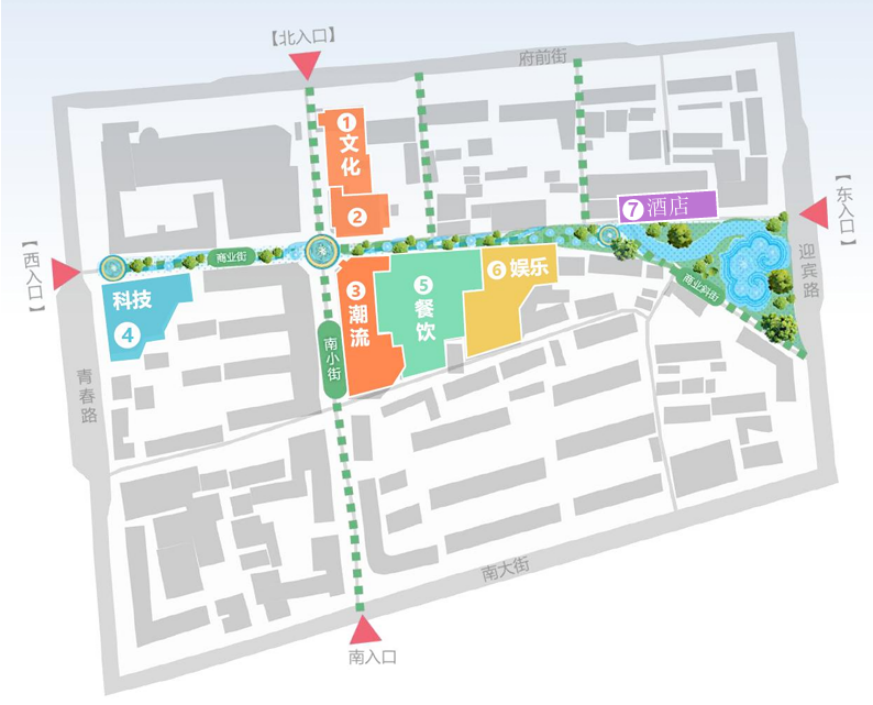 “为破解发展瓶颈、激活街区潜能,这场升级改造势在必行,完成后将全面刷新商业街的功能与颜值。”区住建委相关负责人表示。在业态规划上,项目巧思满满,四大入口将打造成差异化特色空间,让每一处转角都藏着惊喜。北入口呼应周边政府、学校、博物馆资源,规划文化业态;西入口结合现有银行、数码业态基础,升级为科技业态聚集区;东入口打造城市会客厅,以公园景观为核心,布局娱乐休闲业态;南入口则聚焦居民日常生活需求,配置便民型商业,提升社区生活便利性。