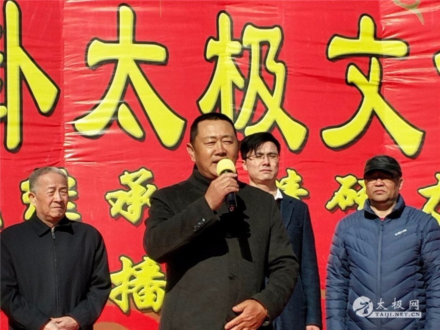 文化节主要发起人、藁城区武术协会会长、陈氏太极拳第十二代传人刘建辉致欢迎辞,他首先向出席本次文化节开幕仪式的领导及嘉宾表示欢迎,同时他指出,本次文化节的顺利开幕离不开各级领导和各相关部门的大力支持和社会各界人士的关心。他表示,本次文化节活动以藁城区梨花节为契机,以区武术协会北周卦陈氏太极拳培训基地、太极拳大酒店、建辉陈氏太极拳培训学校、新建成的太极禅林以及有着太极拳基础的北周卦村、常安镇中学、北周卦小学为平台。旨在传播中华传统太极文化,更好的推动全民健身活动,活跃农村文化生活,进一步展现新时代农村生活新面貌,带动美丽乡村特色旅游产业发展。