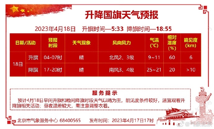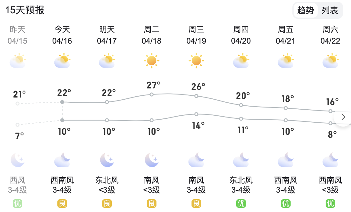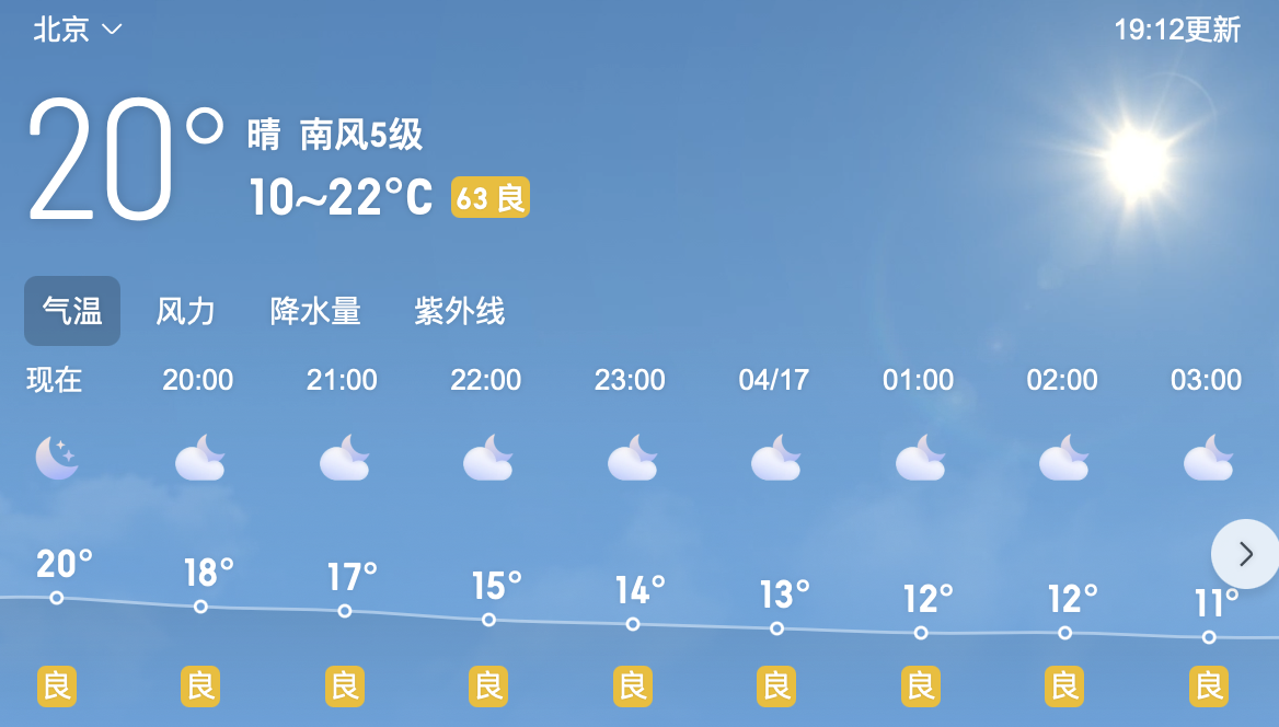 今天夜间多云转晴,东转北风二三级,最低气温10℃;明天白天晴间多云,北转南风二三间四级,最高气温27℃。明日气温继续回升,白天天气适宜户外活动和通风,但早晚体感略凉,仍需适时调整着装。近期持续干燥,日常注意补水保湿和用火安全。