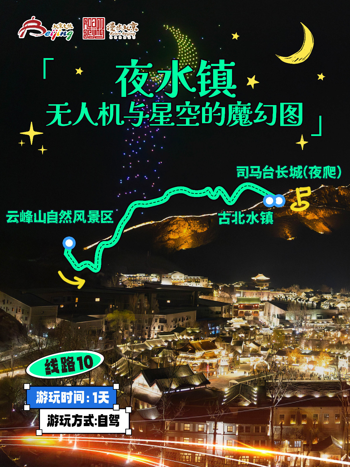 线路特色:在云峰山自然风景区,远眺密云水库,享受山野自由;长城脚下的古北水镇里,烽火传奇与梦幻光影交织,乘摇橹船穿梭碧波之上、美食街品尝特色美食、赏无人机表演编织的银河天幕、泡私汤感受一夜千年的梦幻;夜攀司马台长城,触摸星空下的雄关险隘。