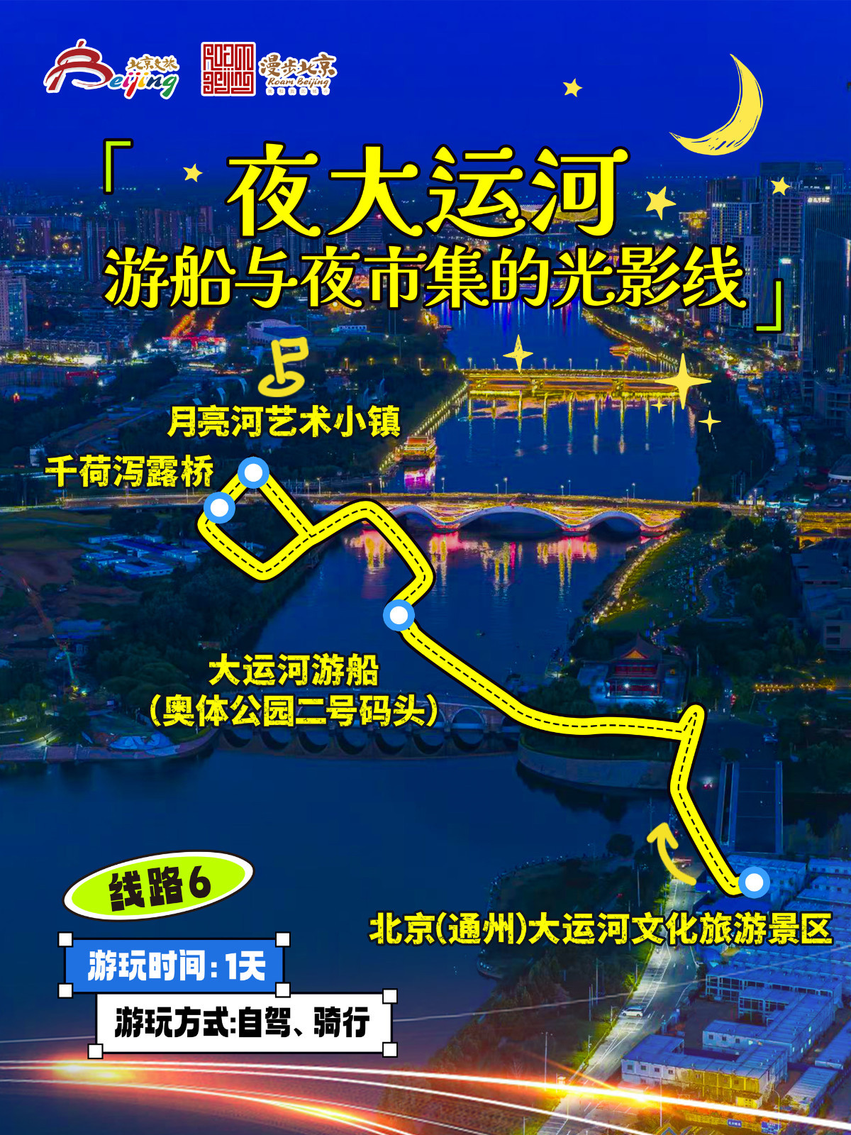 行程:北京(通州)大运河文化旅游景区→大运河游船(奥体公园二号码头)→千荷泻露桥→月亮河艺术小镇