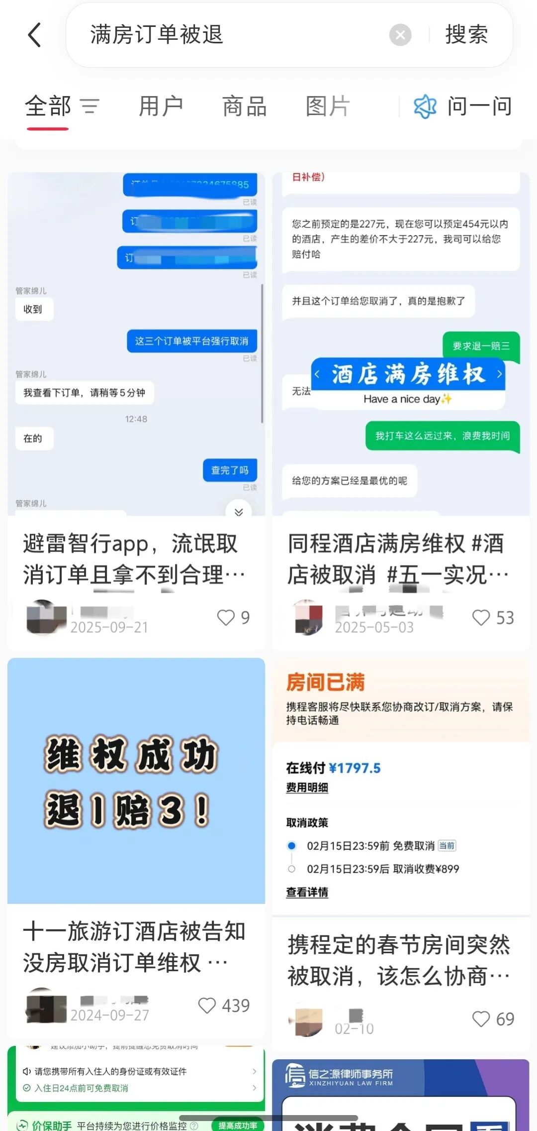 “问北京”记者在社交媒体上搜索“满房订单被退”“线上订房被取消”等关键词发现,许多消费者都曾分享过类似遭遇,最终的维权结果不尽相同。