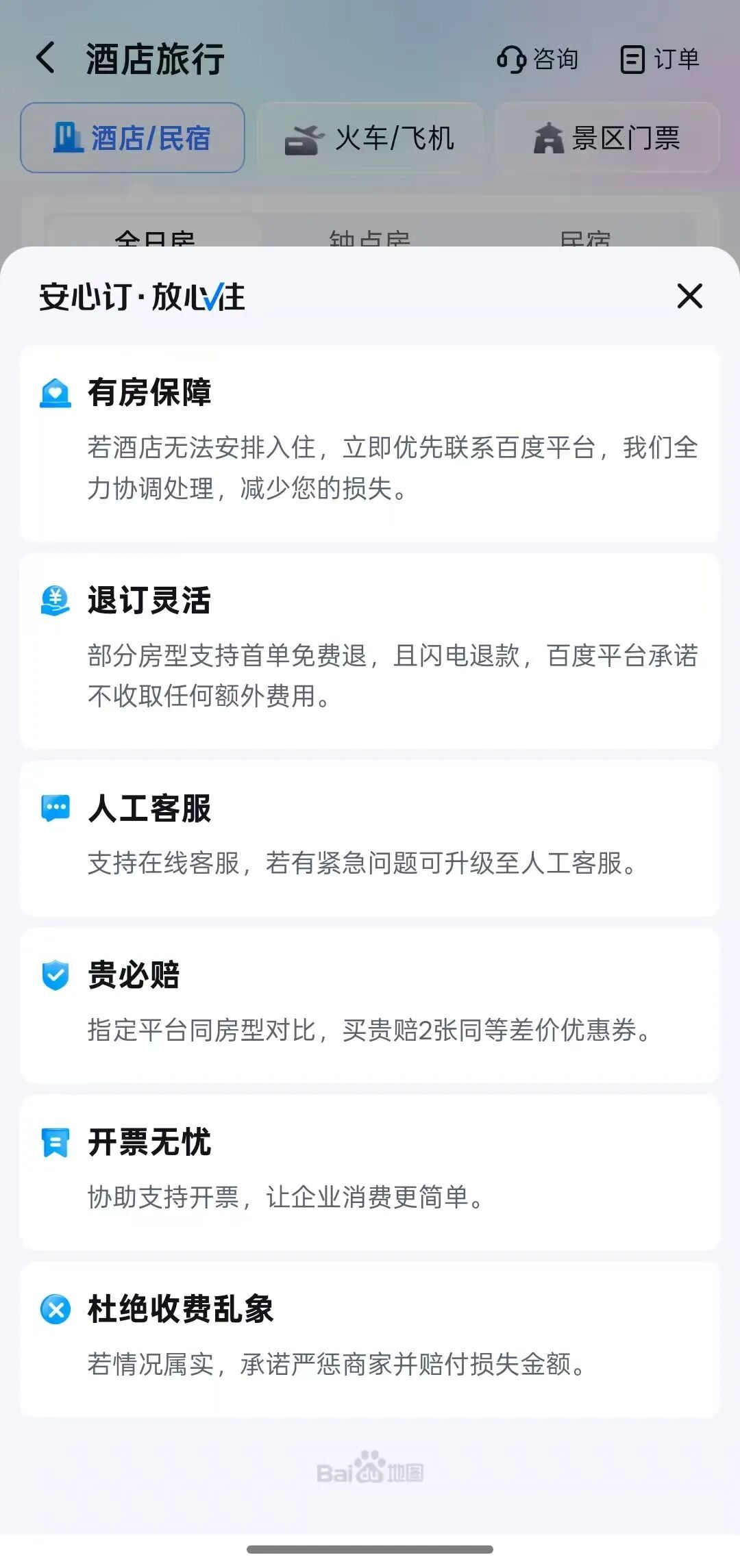 “问北京”记者登录百度地图发现,其住宿预订页面显眼位置,清晰标注着“安心订·放心住”“有房保障”等承诺,可这些承诺,在李女士的遭遇面前显得格外苍白。