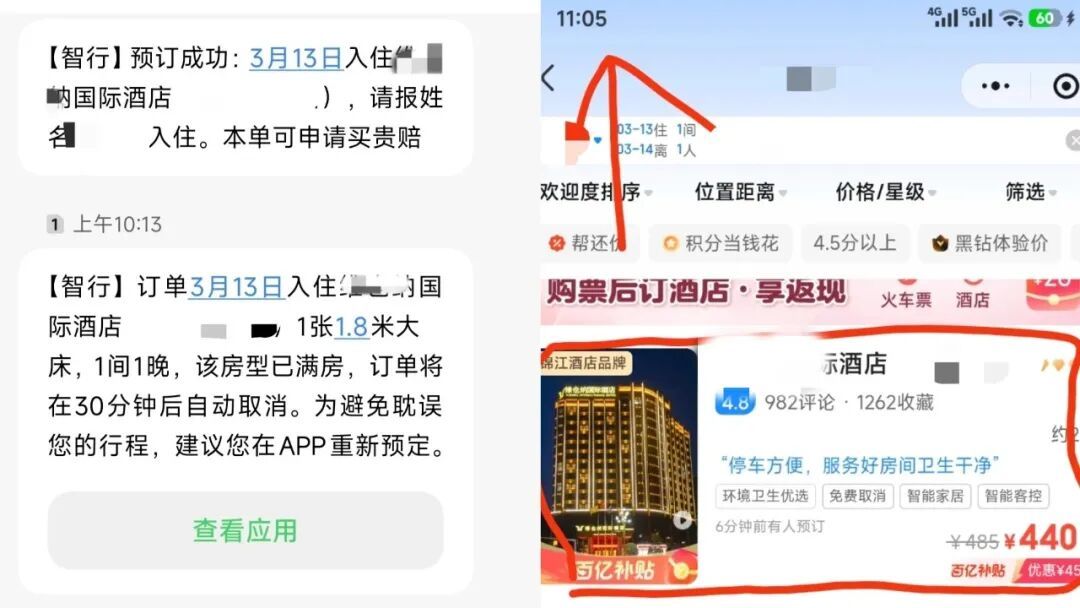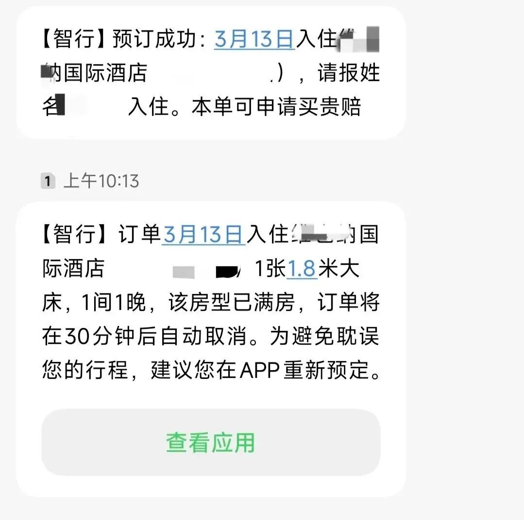 小刘:我在智行的小程序上面订了一个酒店,金额是233元,当时说预订成功。没想到隔了一个多小时,平台就以满房为由取消了我的订单。后来我去小程序查看,发现他们同一家酒店同一个日期没有满房,依旧在售,不过它房间的价格已经涨到了440元。然后,我就跟平台的客服去协商这个事情,他们是说给我发送一个链接,补偿我70多块钱,但是对于我来说,它已经完全打乱了我考试的行程安排。
