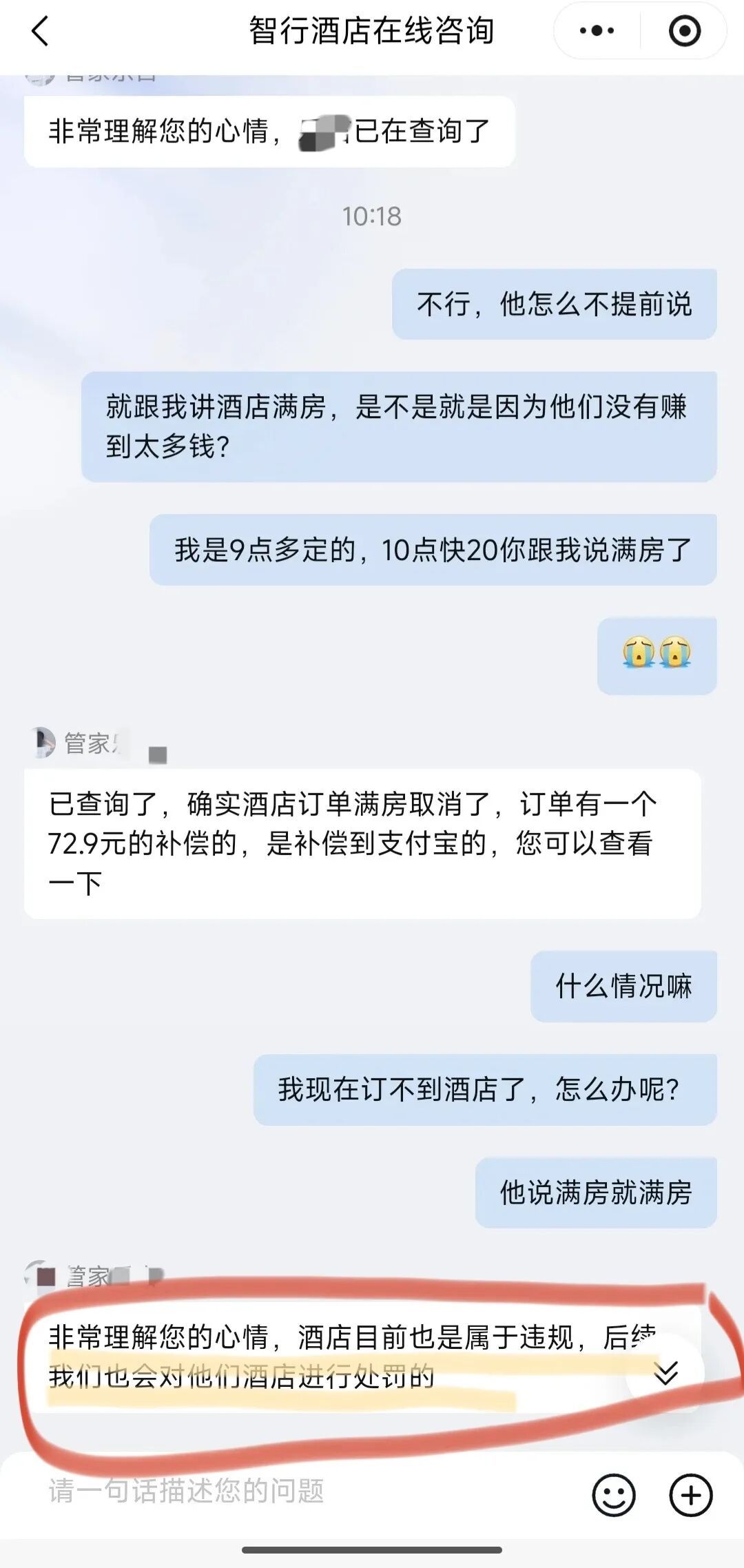 小刘第一时间向多个相关部门投诉,始终坚定主张“退一赔三”。她提供的沟通截图显示,智行平台客服认可酒店行为属于违规操作。