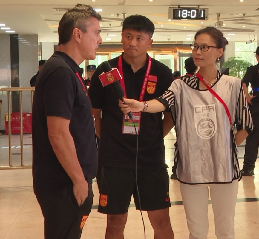 北京广播电视台记者林檬(右)采访U23中国队主教练安东尼奥