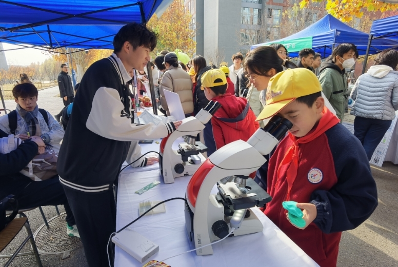 活动由在校学生组成创意团队,通过互动实验的方式,向过往学生展示生命科学的魅力。其中,从香蕉中获取“生命密码”实验、显微镜下的微生物、茚三酮提取指纹的原理等实验操作,吸引学生们驻足观看,并进行实操感受科学的奥秘。此外,该活动还邀请昌平区博智学校的小学生前来参加,与大学生一同学科学,做实验。