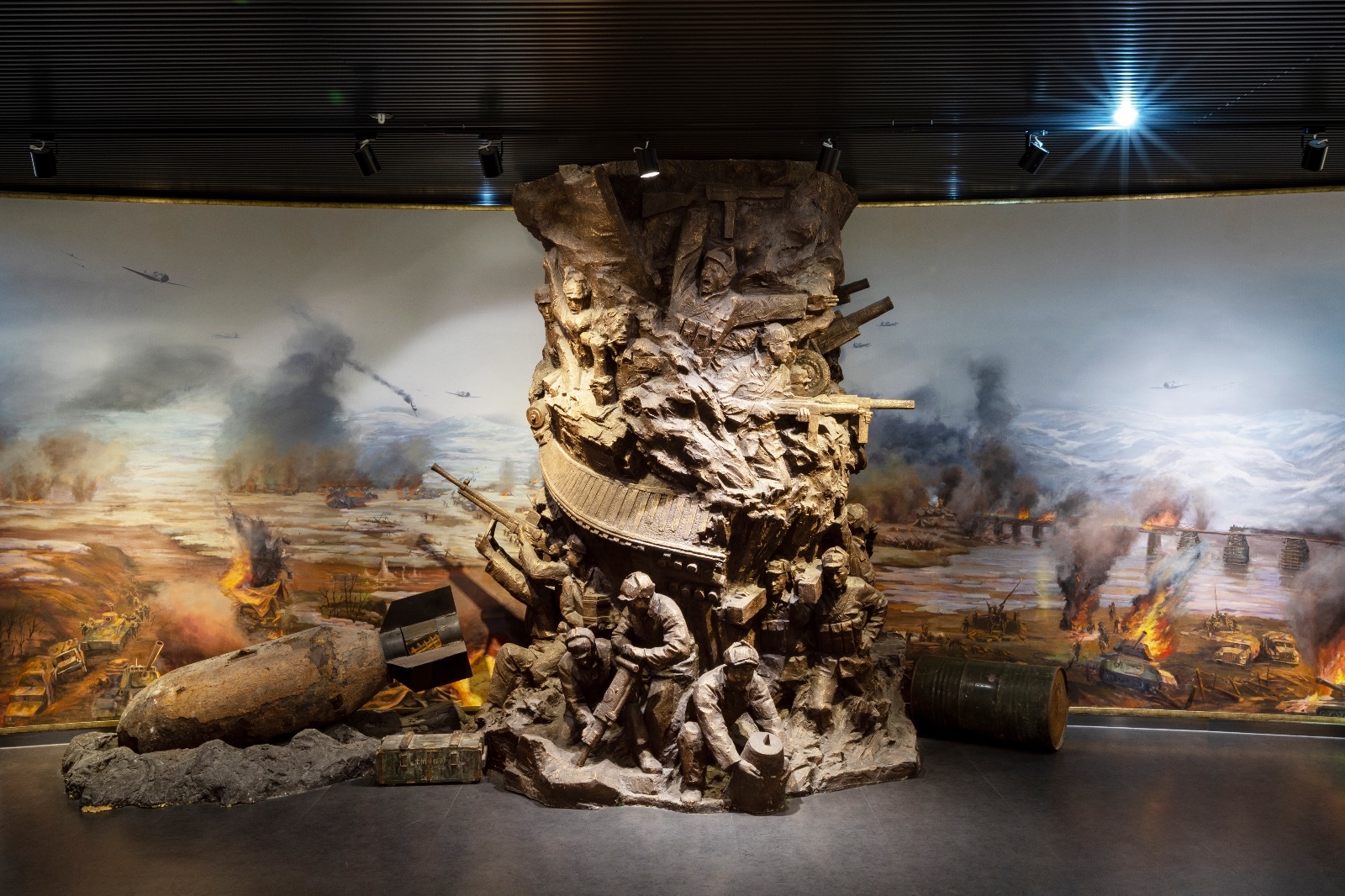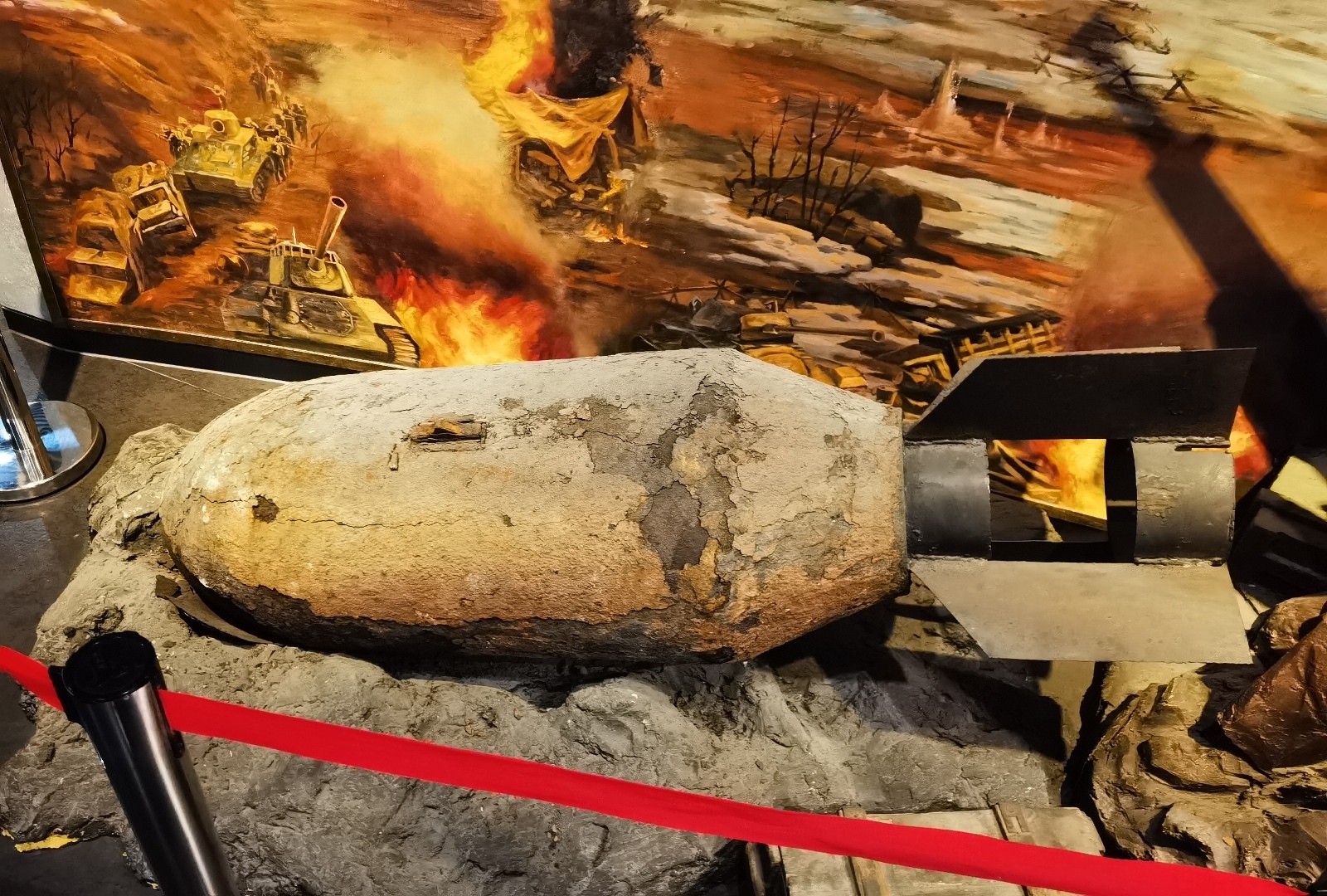 在1950年6月朝鲜战争爆发,将战火烧到了鸭绿江边。应朝鲜请求,中国人民志愿军入朝作战,保家卫国。同年11月,铁道兵陆续入朝,在前进抢修,分段保障,抗洪抢修,粉碎绞杀战中,铁道兵部队创建了打不烂炸不断的钢铁运输线。头顶美机狂轰乱炸,铁道兵随炸随修。在这一场战争中共有1481人牺牲,2989人负伤。眼前这枚炸弹是从朝鲜战场上搬运回来的,这是一颗真实的炸弹。在当时美军向我们投掷了大量的重磅炸弹,钢珠子母弹、细菌弹等。为了排弹,我军也涌现出了许多排弹英雄。