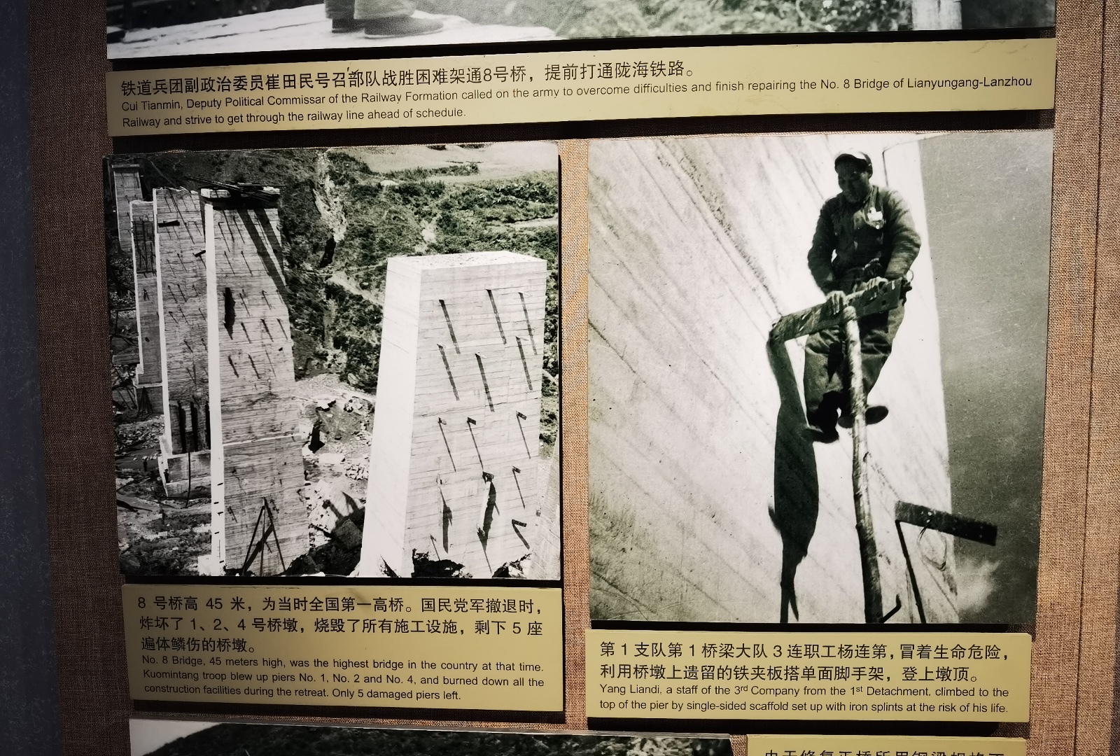 新中国成立前夕,铁道兵奉命抢修陇海铁路8号桥。但由于技术落后,只能靠人力在半空中作业,随时都有可能粉身碎骨。当地的农民常说8号顶8号顶,失手掉成饼,8号端8号端,上桥如上天。杨连第脚踩单面云梯,带头爬上了45米高的桥墩顶面。在墩顶,他仅以一块木板作为掩护,连续爆破了百余次,炸平了5座桥墩顶面。杨连第和他的战友们连续工作了59个昼夜,提前完成了抢修任务。之后,杨连第被誉为登高英雄,这座桥也被命名为杨连弟桥。这也是全国唯一一座以人名命名的大桥。