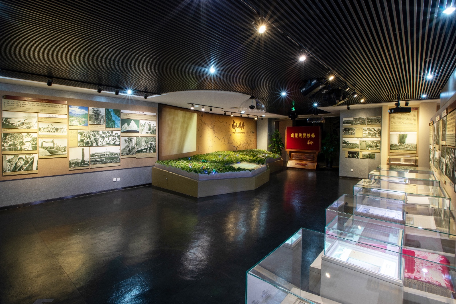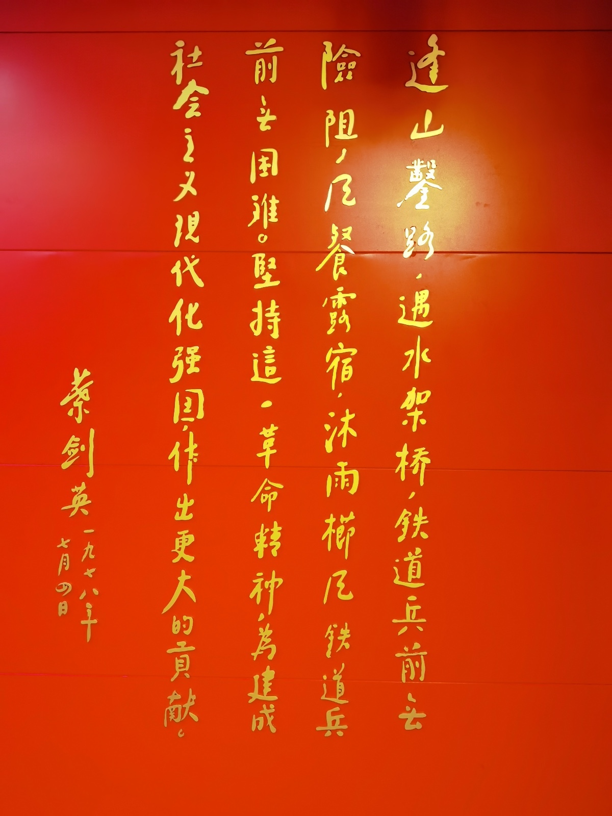 右侧是纪念铁道兵成立30周年之际,时任中共中央副主席叶剑英的亲笔题词,他写道:逢山凿路,遇水架桥,铁道兵前无险阻;风餐露宿,沐雨栉风,铁道兵前无困难。坚持这一革命精神,为建成社会主义现代化强国,作出更大的贡献。这是对铁道兵丰功伟绩的高度褒奖,也把我们带回到铁道兵那段艰苦岁月。