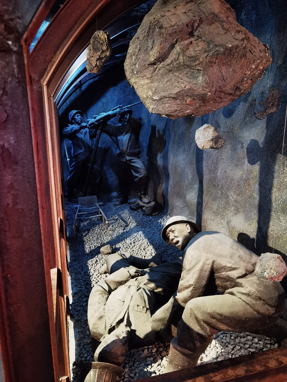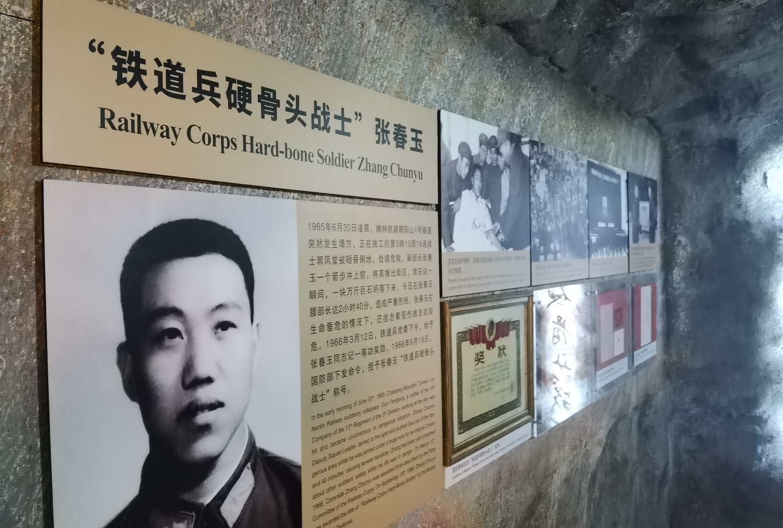 嫩林铁路朝阳山一号隧道当时出现了大塌方。躺下的这名叫郭凤堂的战士,因为有一块钢盔大小的石块砸到了他的安全帽上,直接让他当场就昏倒了过去。而他的副班长张春玉一个箭步冲上去把他救了下来,但他自己却没有躲过这场大塌方,他头顶一颗万斤重的巨石瞬间就砸到了他的身上,当场他就昏迷了两个小时40分钟。他醒来了之后,第一句问的就是“我的战友们都还好吗?我兜里面还有几角钱,明天就是7月1日党的生日,请帮我把党费交了吧。”在这一场大塌方中,他当场就被砸断了一条大腿和三根肋骨,造成了残疾。之后,国防部下令嘉奖了他,为他授予了“铁道兵硬骨头战士”的荣誉称号。