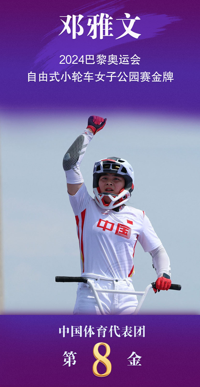 7月31日,在巴黎奥运会自由式小轮车女子公园赛决赛中,中国选手邓雅文夺得金牌。这是中国代表团在本届奥运会获得的第8枚金牌。