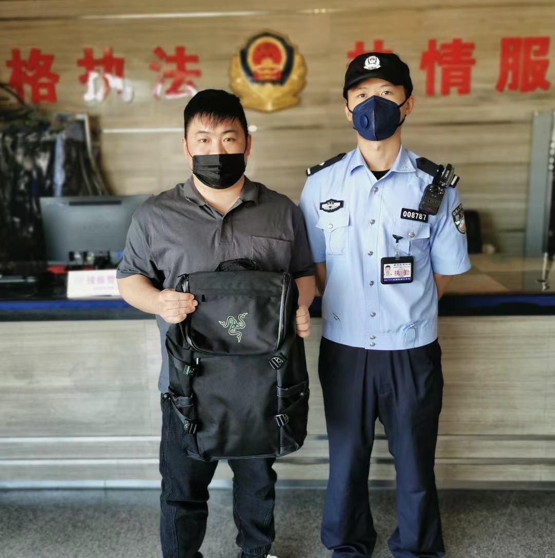 经查,该黑色双肩背包内装有失主苏先生的身份证以及钱包、MacBook苹果笔记本电脑、索尼金砖播放器、Airpods耳机等贵重物品。捡到背包后,民警首先询问了周边旅客具体情况,同时调取公共视频。经过多方查找,终于与失主苏先生取得了联系。据失主事后称,背包内物品总价值约10万元人民币。2021年6月8日,苏先生送来一面写有“品德高尚,学习楷模”等字样的锦旗向民警表示感谢。