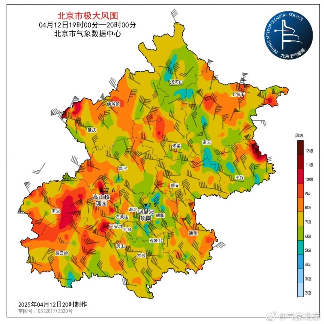 12日19-20时北京市部分地区阵风8~10级,山区局地13级。全市有170个测站极大风达8级以上(占比30%),50个测站极大风达9级以上(占比9%),18个测站极大风达10级以上(占比3%)。10级以上的站出现在丰台、石景山、房山、怀柔、平谷、门头沟、延庆、密云。全市最大阵风风速:高山站门头沟高山玫瑰园37.6米/秒(13级);平原地区顺义温榆河顺义园23.6米/秒(9级)。