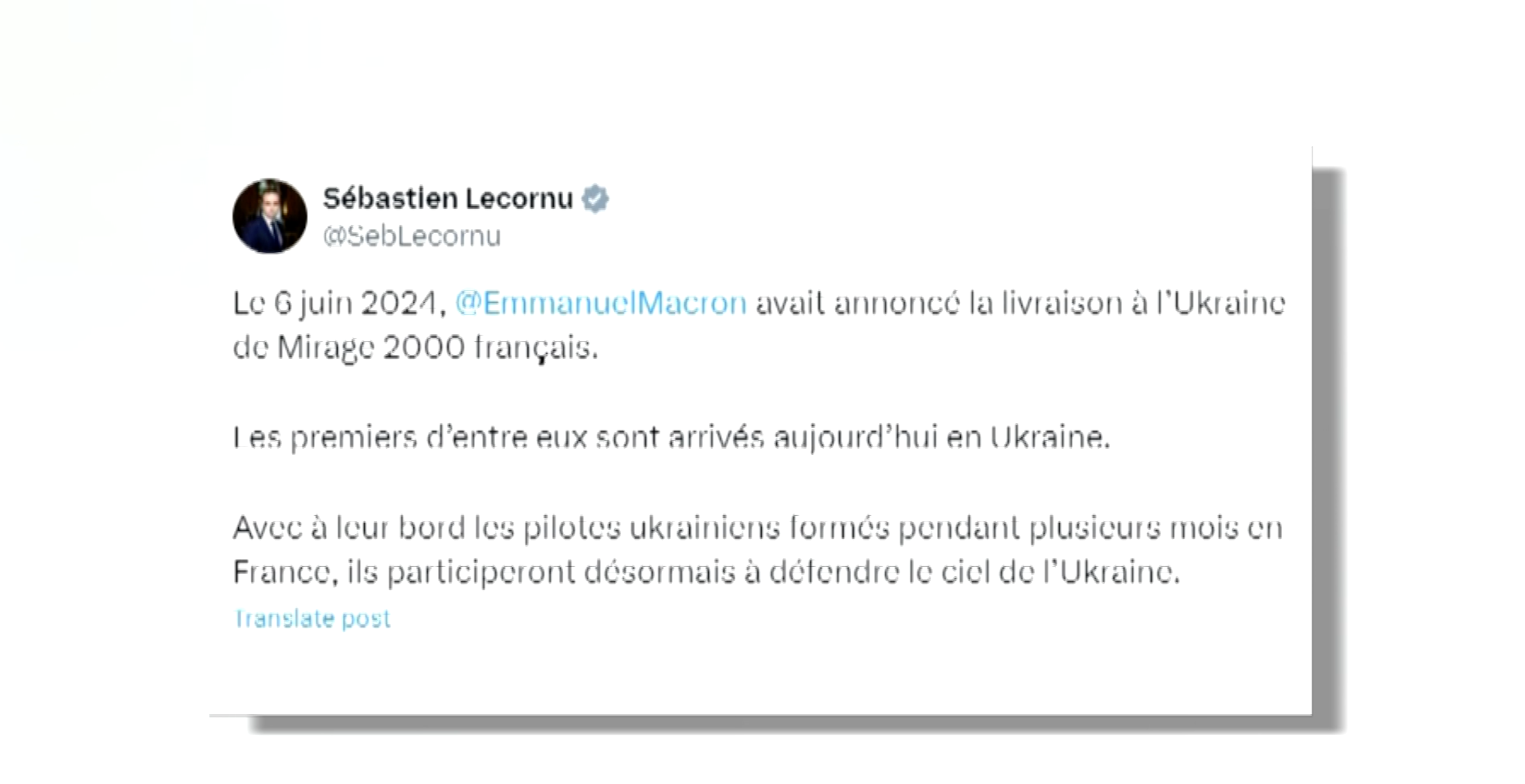 据法新社报道,法国国防部长塞巴斯蒂安·勒科尔尼6号表示,法国已于当天向乌克兰交付首批“幻影-2000”战斗机。