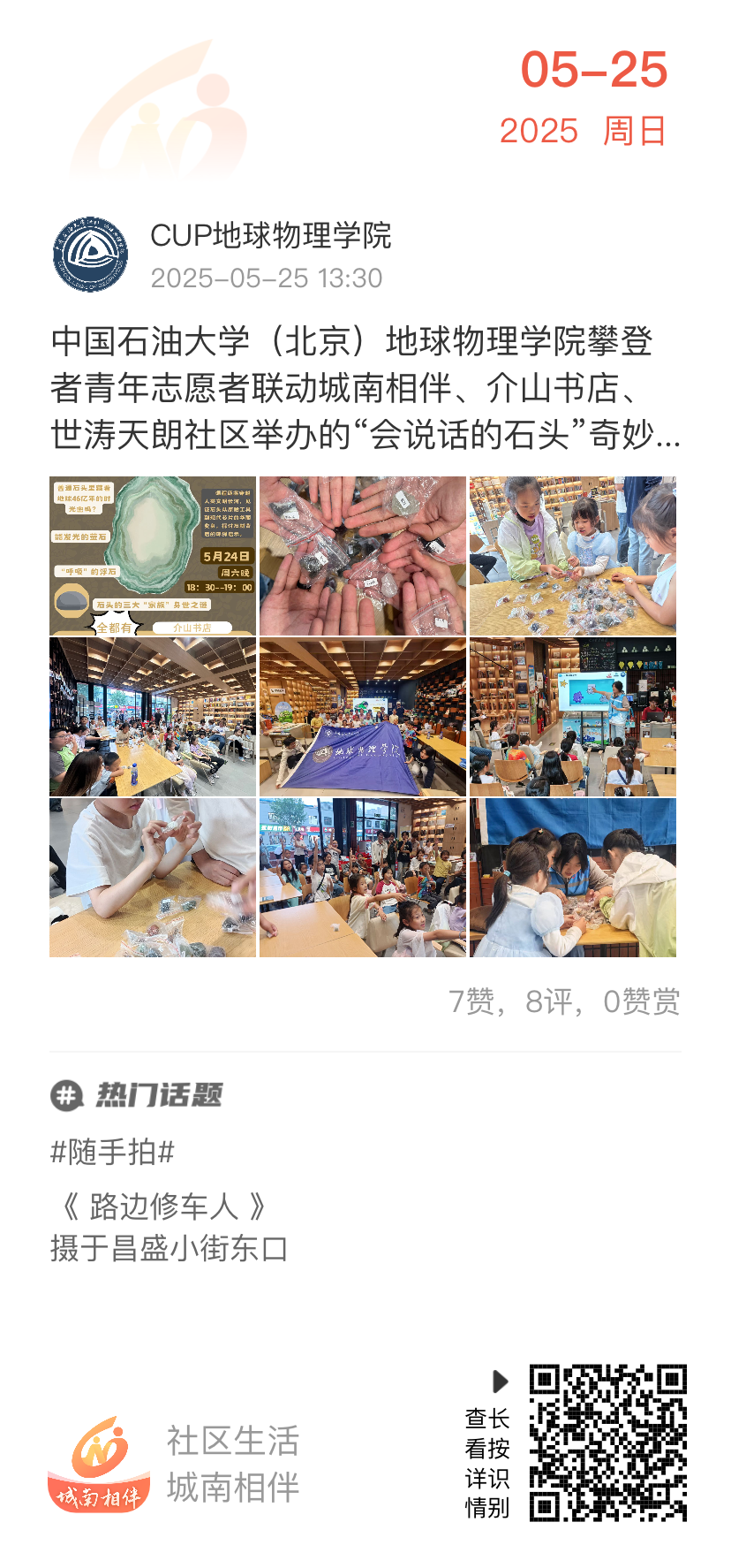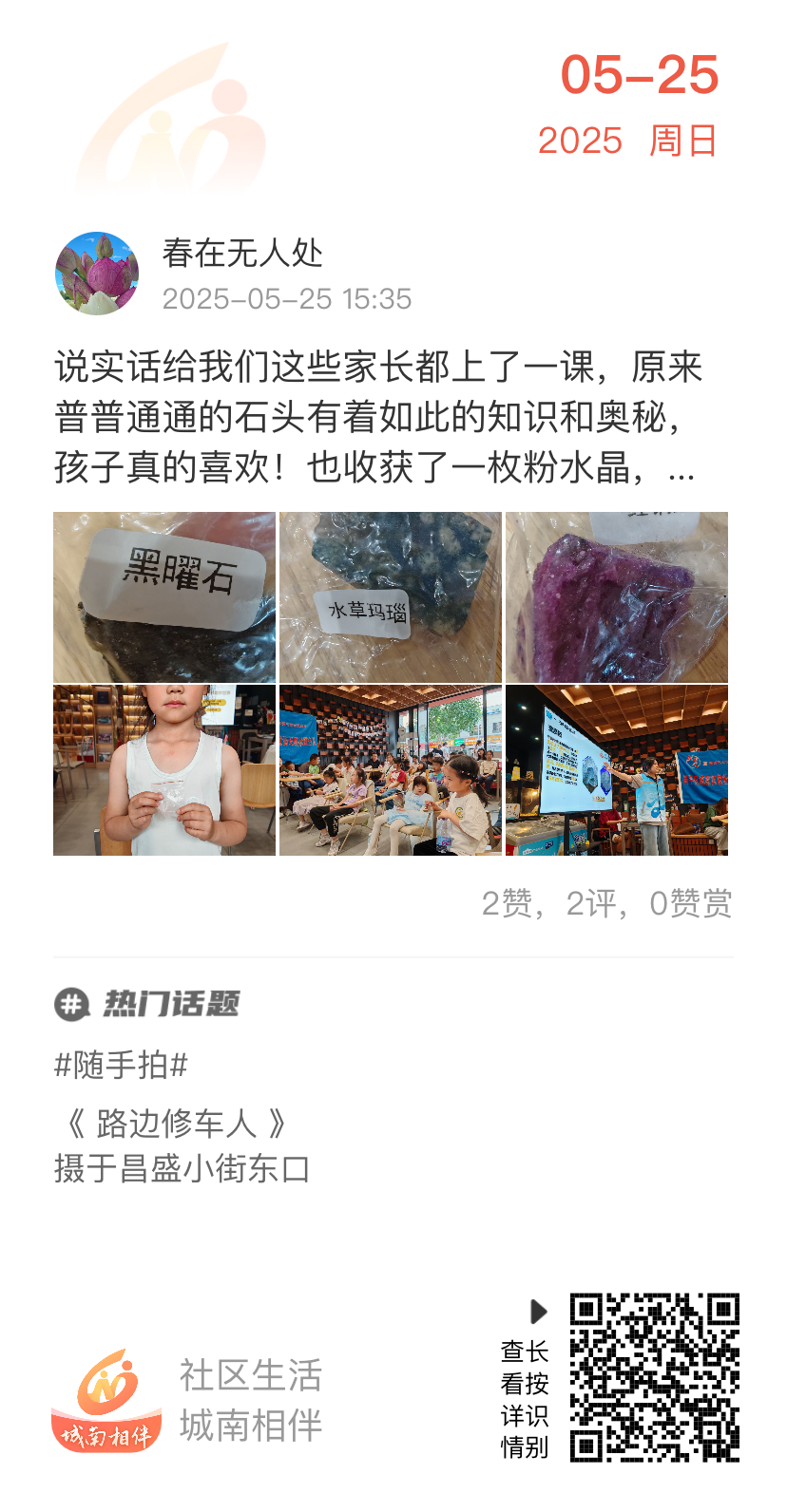 这场活动,不仅让孩子们在玩乐中学习到了丰富的地质知识,还增进了亲子间的互动与交流。看着孩子们兴奋的小脸,家长们纷纷在城南相伴App上记录下了活动瞬间与感想!
