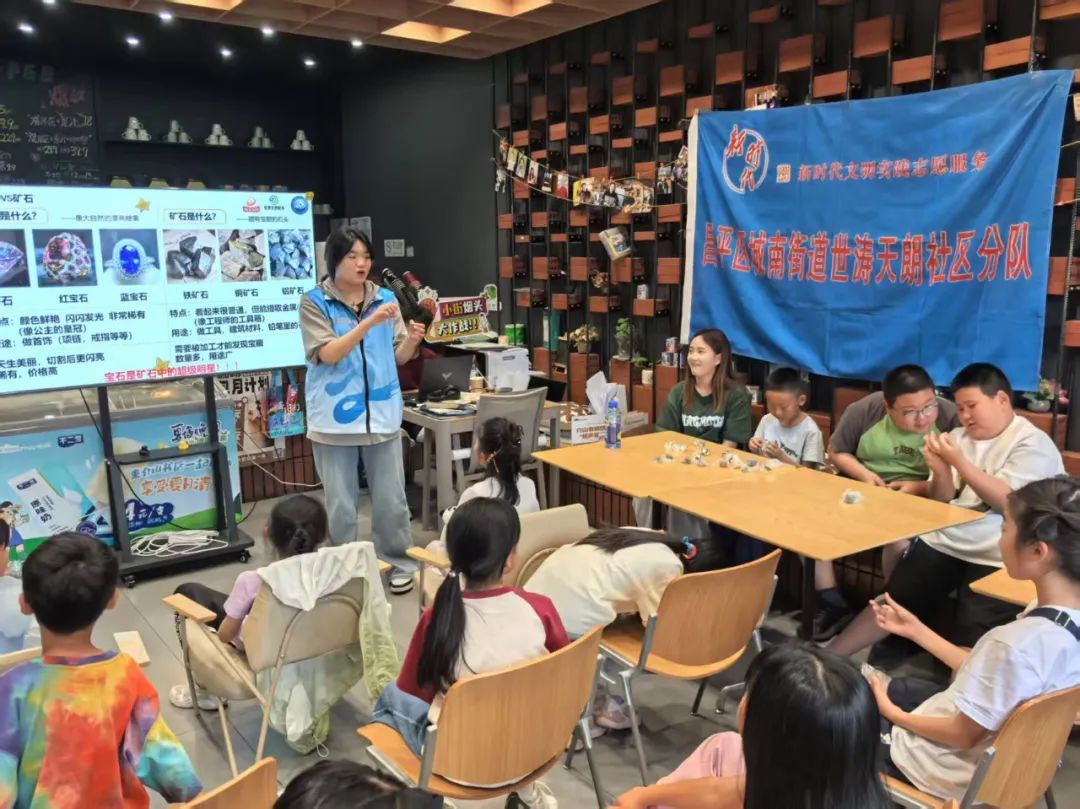 现场互动环节更是热闹非凡。有奖问答环节,小朋友们的小手举得像小树林一样,积极抢答,答对就能解锁神秘岩石“盲盒”。每个小朋友都拿到了红钢玉、黑曜石、水草玛瑙等各种各样、五光十色的岩石“盲盒”,大家仔细观察,热烈讨论,探索着石头的奥秘。来自昌盛园小学9岁的小朋友赵忱玮说:“大姐姐讲的地质知识有趣好玩,希望下次还能继续参加!”