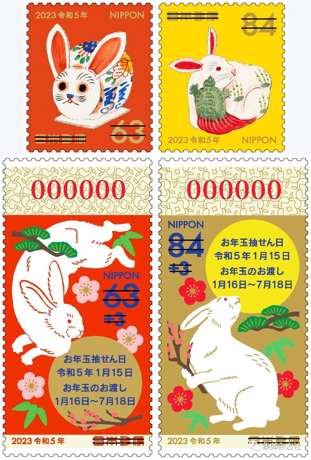 2022年11月1日,日本邮政发行了2023年贺年邮票。该套邮票共计4枚。4枚邮票中的两枚非有奖附捐邮票主图使用了日本画家川崎巨泉绘制的乡土玩具,川崎巨泉一生绘制的乡土玩具超过5000种,是研究日本乡土玩具宝贵的历史资料;另两枚为有奖附捐邮票,由吉川步美设计。