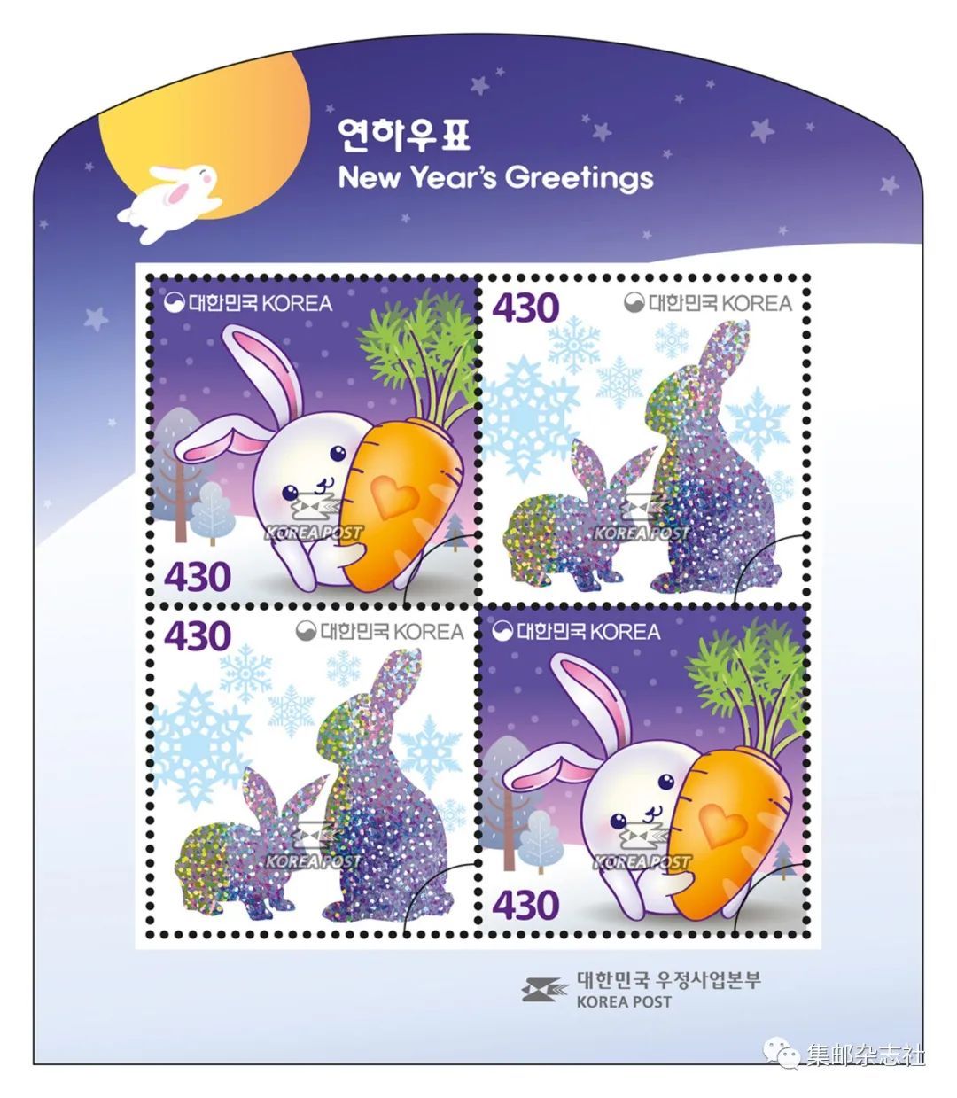 韩国邮政将于2022年12月1日发行兔年生肖邮票一套2枚,邮票规格为35mm×35mm,面值均为430韩元,发行量为84000套。同时还将发行小全张一枚。该套邮票由申在勇设计,采用四色印刷并使用激光全息等工艺。