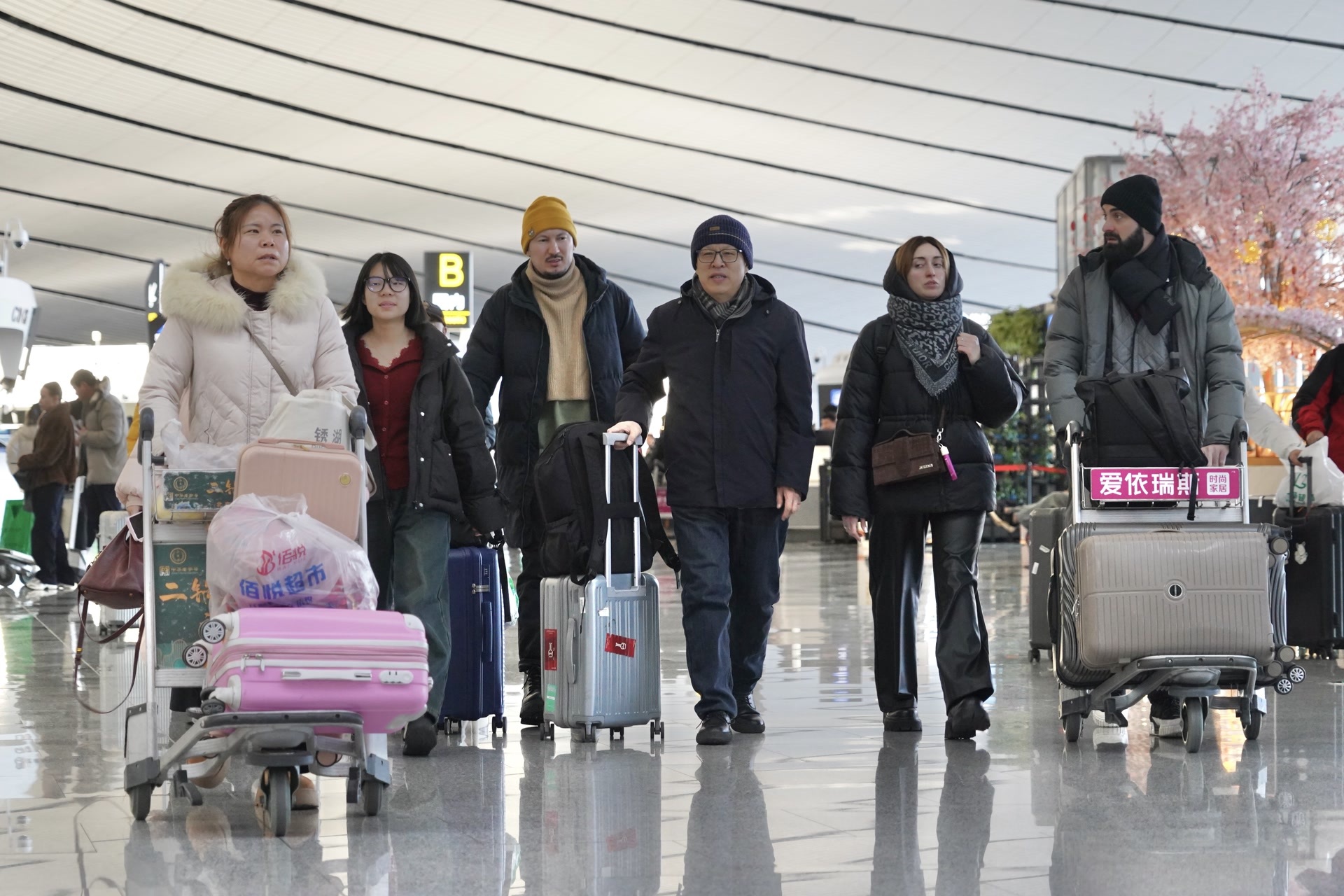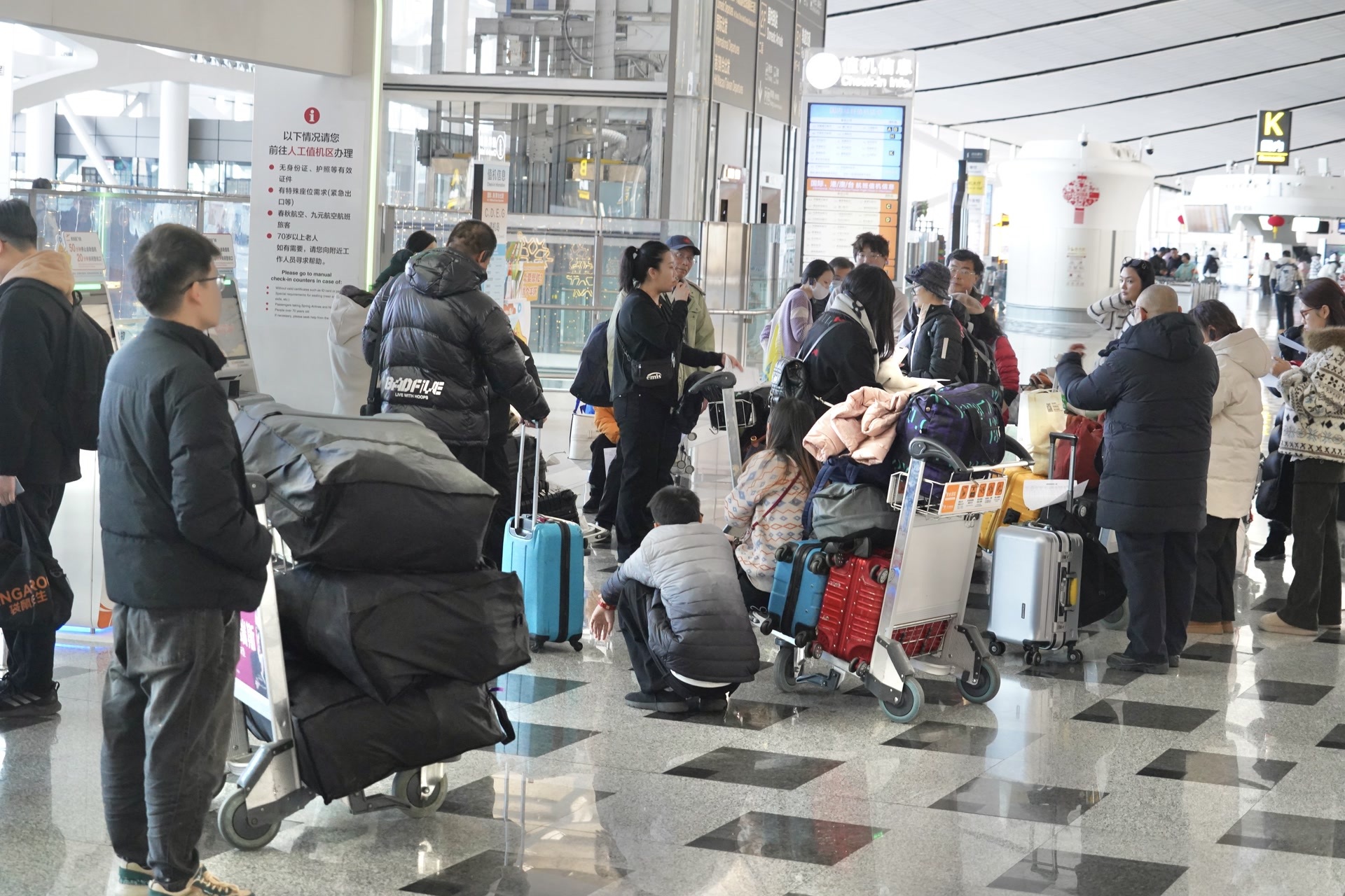 今年,大兴机场组织281名志愿者支援春运服务一线,同时联合中航信、国家电网等组建“跨界志愿联盟”,在航站楼关键区域设置流动服务岗,为旅客提供精准引导与即时帮扶。值机环节推出行业首创的“外航国际值机通办”,开通国际自助值机和无纸化出行服务,旅客平均出行时间缩短15分钟以上;安检环节设置两条“易安检”专道,通行效率提升40%。此外,大兴机场推出国内中转行李代提服务,“安兴睡”过夜服务也将进一步升级,全面打造便捷温馨的春运出行体验。