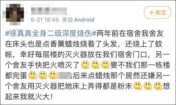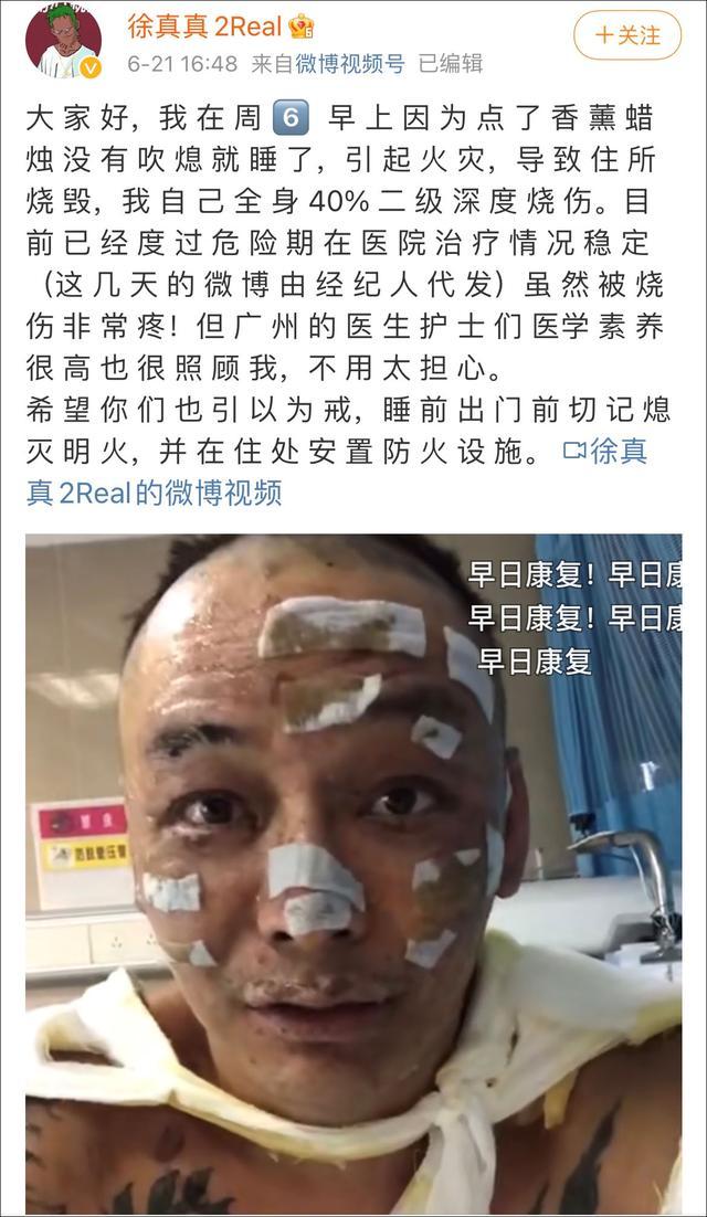 话说回来,现实中,还有后果比引燃头发更严重的情况。我之前就看到过这么一个新闻,2021年6月,一名说唱男歌手徐真真,在微博发帖透露,自己点了香薰蜡烛没有吹灭就睡着了,结果引起火灾,导致家被烧毁,自己全身40%二级深度烧伤,非常疼。庆幸的是,经过治疗,他脱离了危险期。他发帖的目的,是为了提醒大家,睡前、出门前要记得熄灭明火,并在住处安置防火措施。