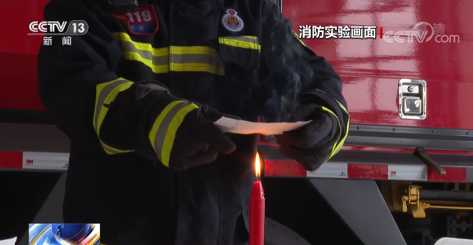 在另一个实验中,消防员手拿纸巾,垂直放在蜡烛上方。可以看到,就算在离明火还有一段距离的情况下,纸巾也很快被引燃。对此,消防员说,蜡烛上空的温度很高,足以超过纸张的燃点,所以就出现了起火。