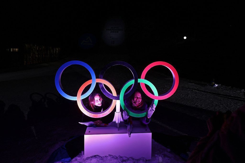 当地时间2026年1月30日,法国库尔舍维勒奥运跳台滑雪场,为迎接2030年法国阿尔卑斯冬奥会会徽的到来,人们在奥运五环前合影。