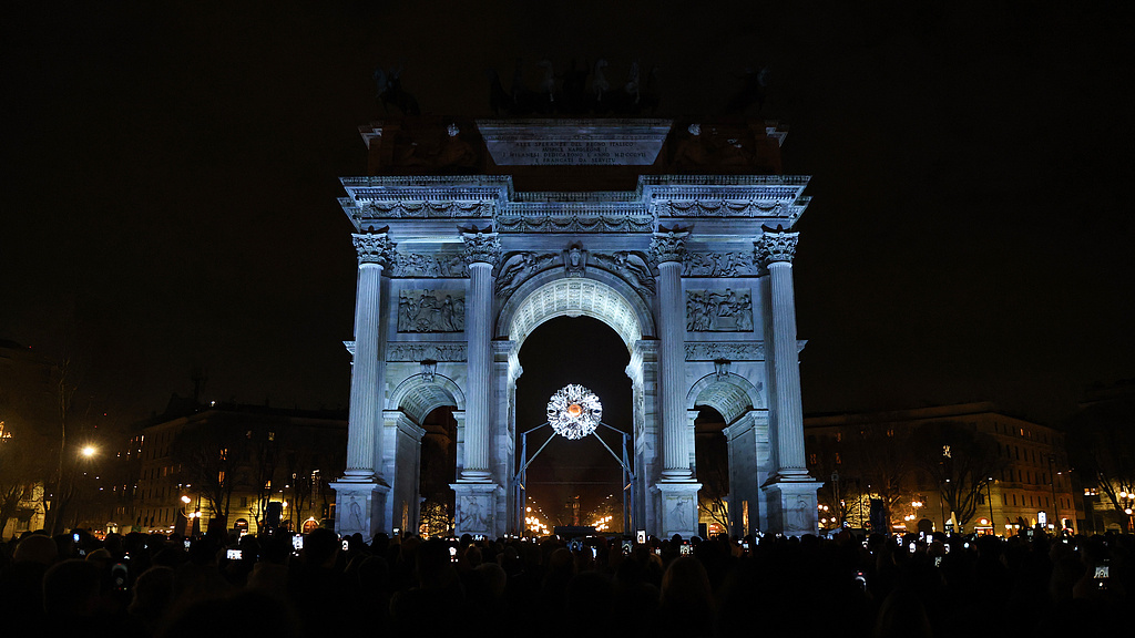 当地时间2026年2月7日,意大利米兰,市民及游客在“和平之拱”圣火台前拍摄圣火。