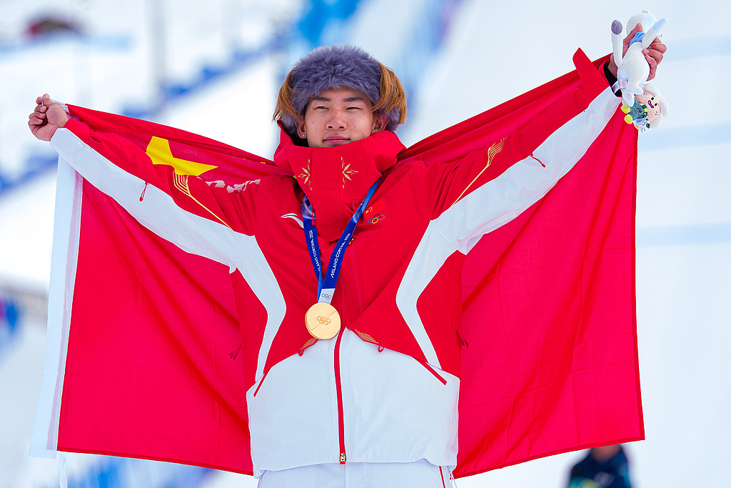 当地时间2026年2月18日,意大利利维尼奥,2026年米兰-科尔蒂纳冬奥会单板滑雪男子坡面障碍技巧奖牌颁发仪式后,中国选手苏翊鸣手持国旗留影。