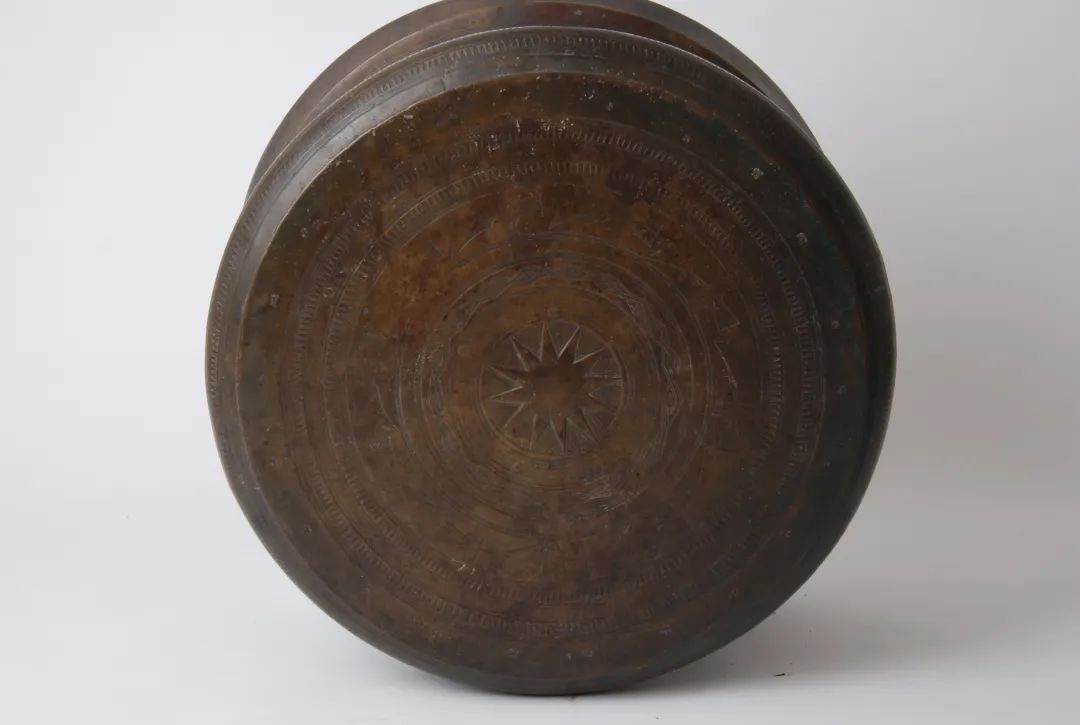 铜鼓,铸铜为之,虚其一面,覆而击其上。