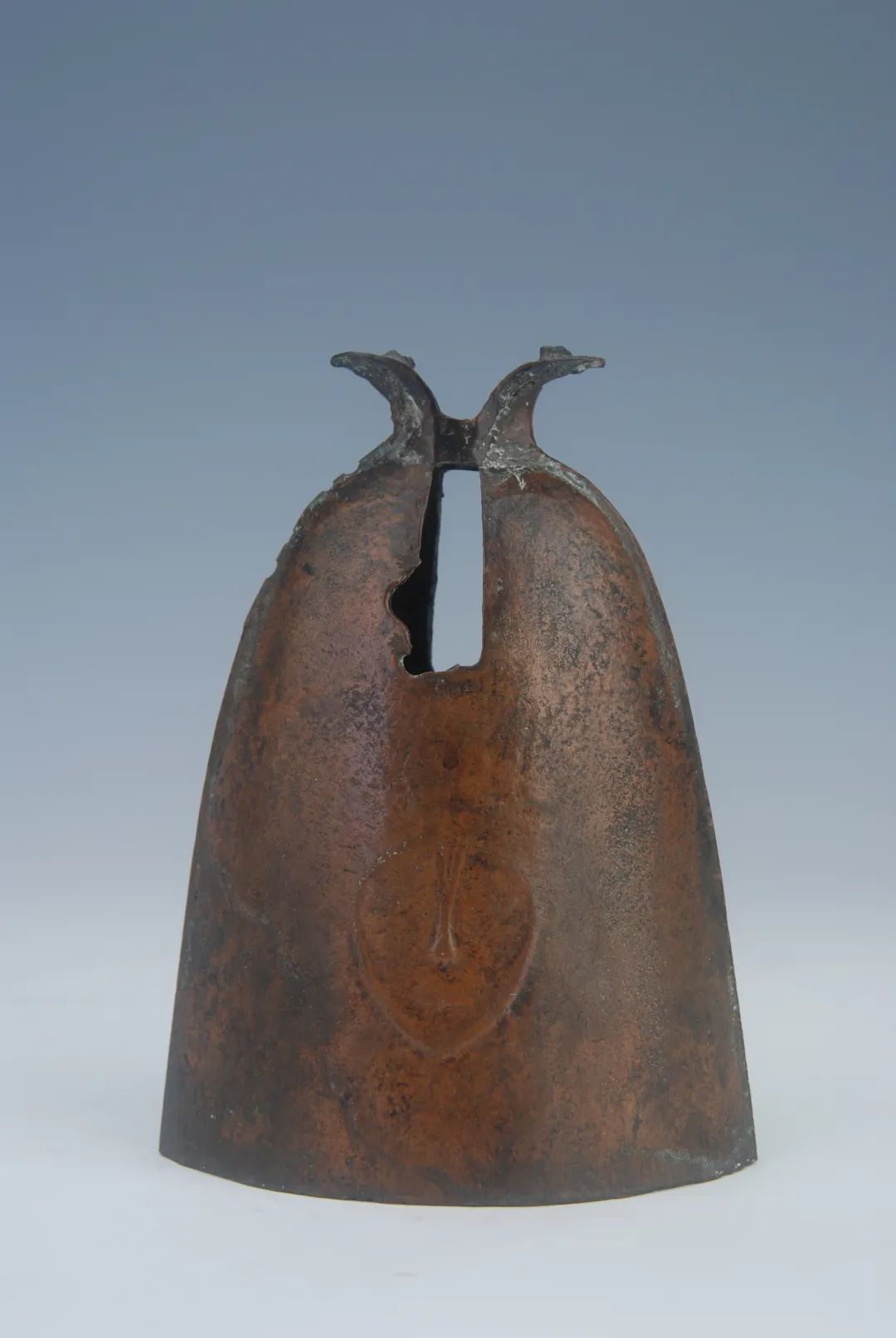 △人面纹羊角钮铜钟,罗泊湾汉墓出土,现藏于广西壮族自治区博物馆。
