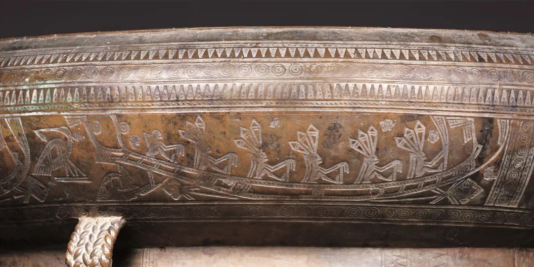 鼓身还饰有羽人划船纹和羽人舞蹈纹