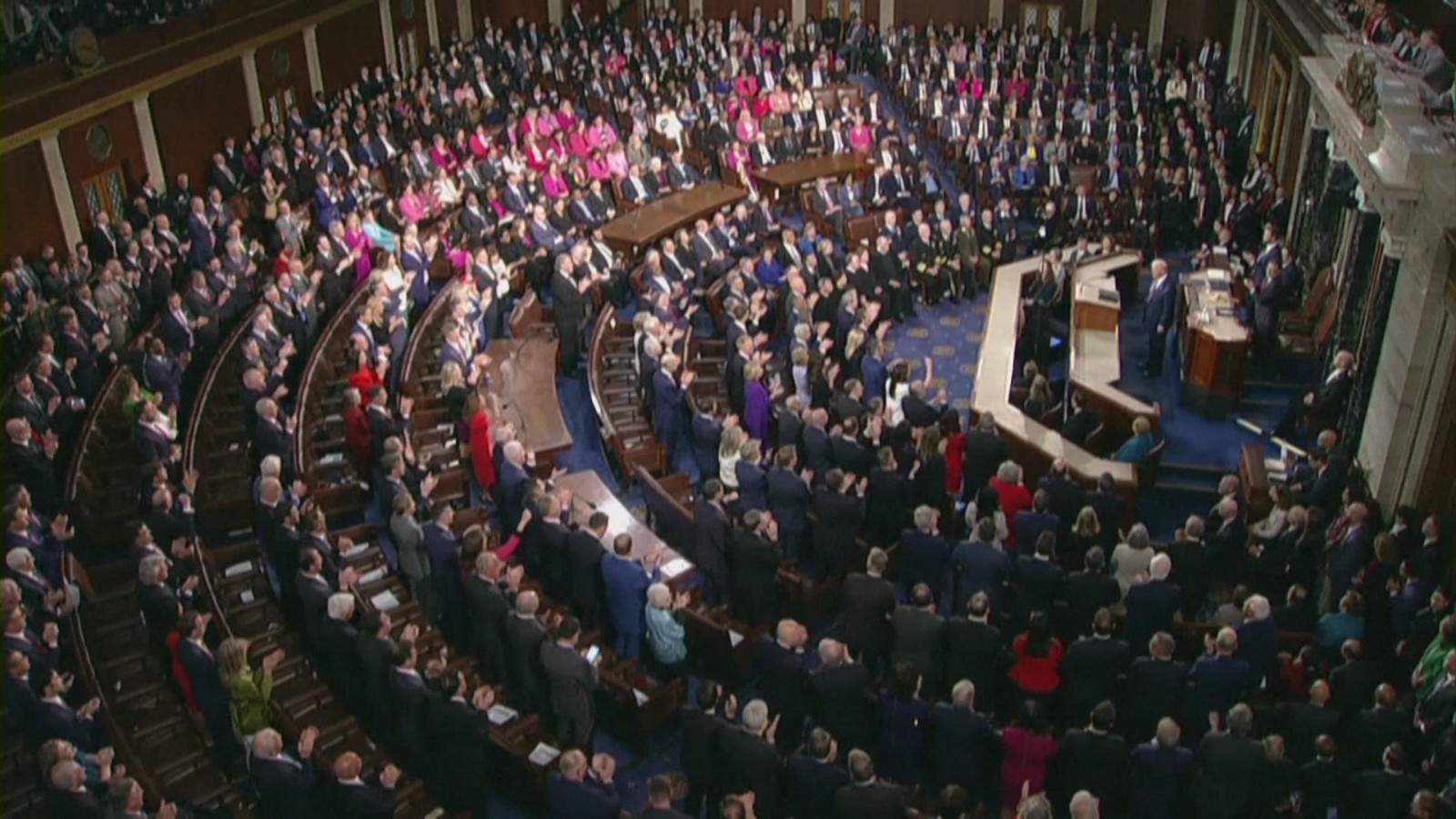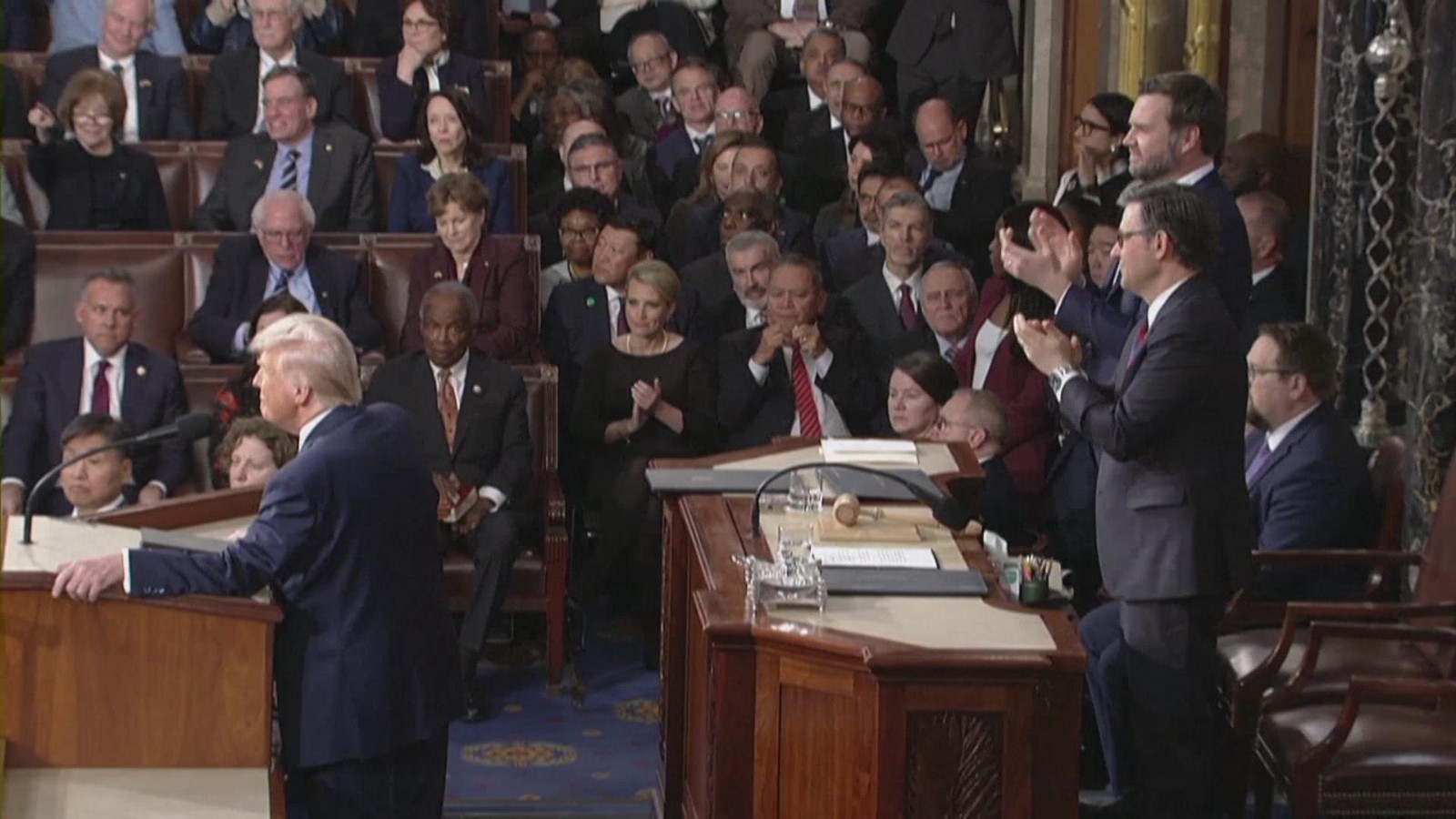 当天,共和党议员和民主党议员分别坐在两边。当共和党议员对特朗普的讲话发出欢呼、鼓掌时,民主党议员却没有回应,或是报之以嘘声和嘲笑。
