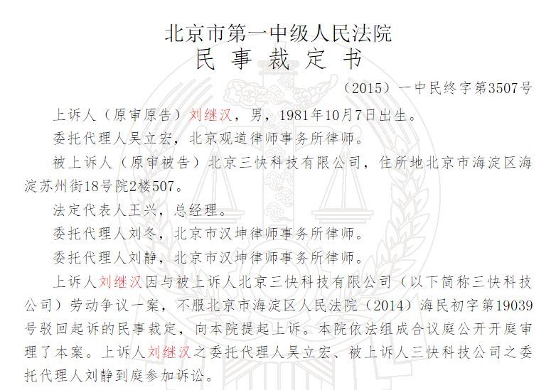 2014年开始,先是向法院提起股权诉讼,但法院以“属于劳动争议”未受理,建议仲裁。但劳动仲裁机构以不属于受理范围为由而作出不予受理的决定。刘继汉再以劳动争议将美团运营主体北京三快科技有限公司(下称三快公司)诉之法院,这次开庭审理,但法院认为一审认为,授予期权的是美团公司,而非劳动合同的签署主体三快公司,裁定驳回。
