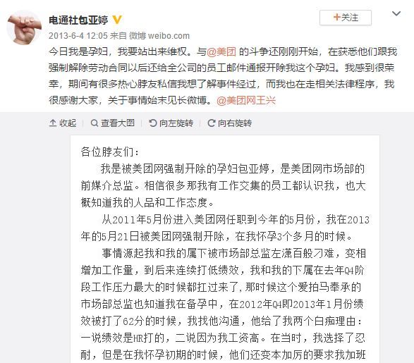 她因为孕期被裁员时,出身阿里的时任美团COO干嘉伟曾用“阿里巴巴员工体系风格”与之沟通,说“你累了可以回家休息,薪水照旧”。后来事情闹到媒体上,美团发出开除通知单后,美团高级副总裁王慧文亦曾表示“可以调解”。