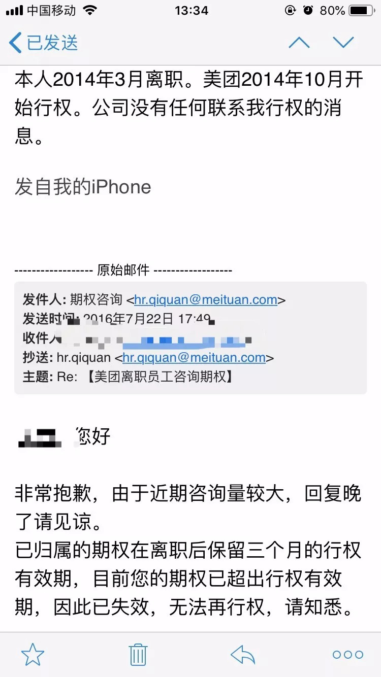 在美团工作超5年的阿苍2015年离职,办理手续时经同事提醒要求行权。彼时美团正值与大众点评合并,美团邮件解释称以内合并影响,她的“离职不牵扯多少天行权,财务理顺期权关系后可行权时会通知”。一等就是一年,一年之后再联系是,原来的对接人已经离职,新对接人表示已经行权通知,过期失效了。