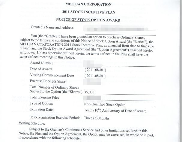 2011年8月1日,美团授予刘继汉35000股MEITUAN CORPORATION(美团注册于开曼群岛的公司,下称美团公司)期权。时间财经看到的期权文件显示,期权的授予日与起始日均为2011年8月1日,每股行权价0.4美元。根据美团点评招股书,MEITUAN CORPORATION为该集团的全资附属公司。