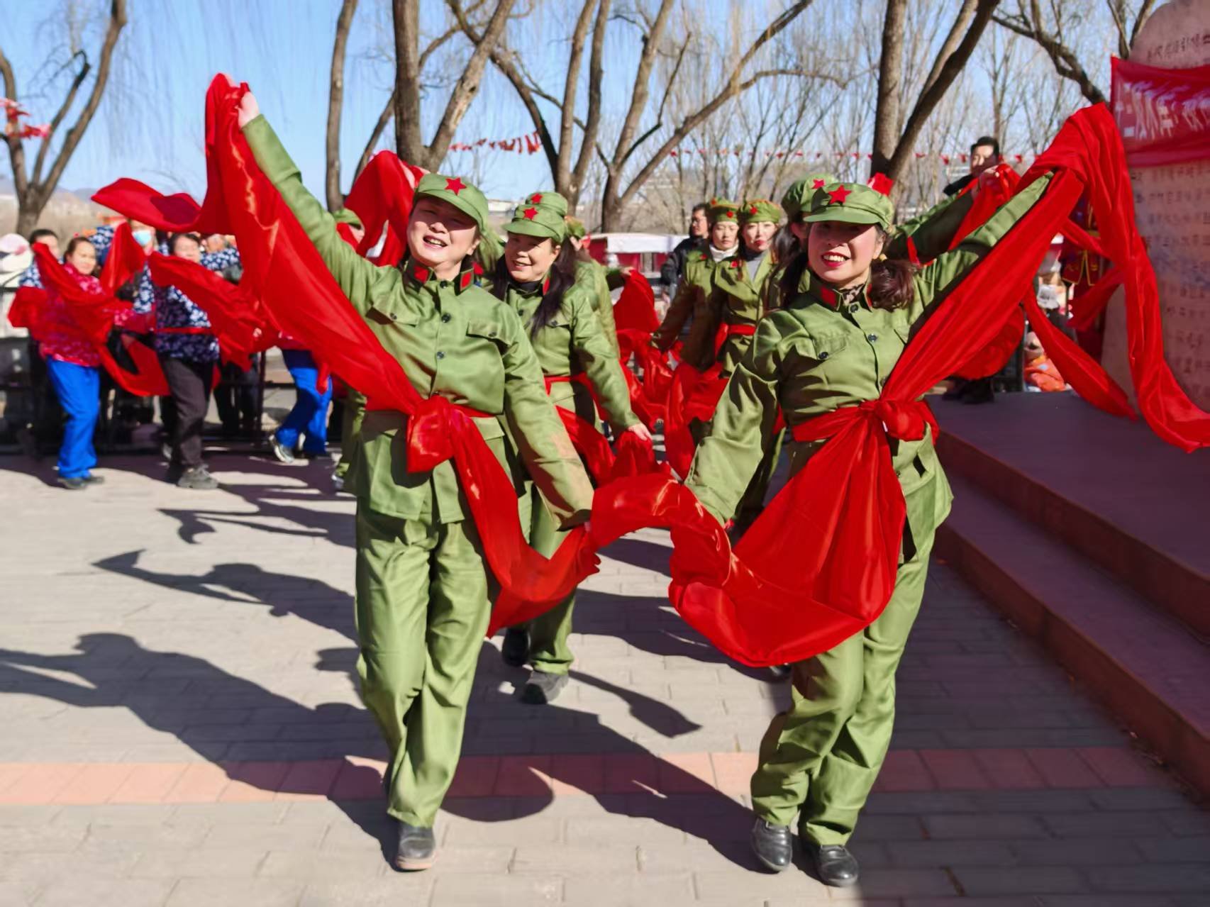 随后,经典舞蹈《大海航行靠舵手》激昂上演,演员们精神抖擞、舞步矫健,展现出新时代村民昂扬向上的精神风貌,唤起中老年观众的时代记忆。喜庆的扭秧歌表演将氛围推向高潮,彩扇飞舞、红绸飘扬,演员们神采飞扬、舞步灵动,队伍时而如长龙蜿蜒,时而似彩蝶飞舞,庙会现场化作一片欢乐的海洋。