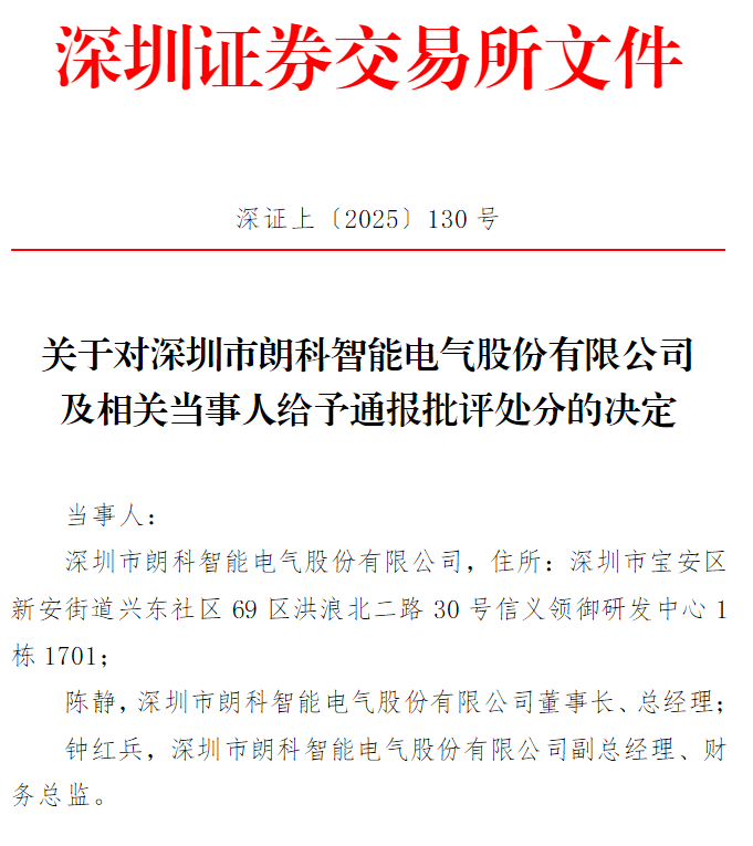 2月20日,深交所发布纪律处分决定书,对深圳市朗科智能电气股份有限公司(以下简称“朗科智能”)及相关责任人因擅自变更募集资金用途、未履行信息披露义务等违规行为给予通报批评。