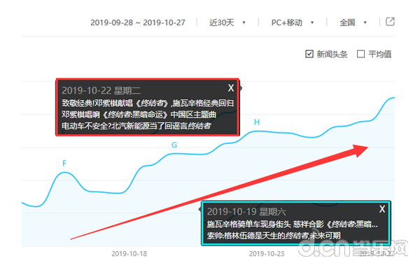 从百度指数可以看出,凡是搜索“终结者”这一关键词,出来的热搜内容一定与新电影宣传动态有关。比如知名歌手邓紫棋献唱《终结者:黑暗命运》中国区主题曲,又比如电影主演之一施瓦辛格骑单车现身街头与粉丝合影。其中邓紫棋献唱的热门新闻使“终结者”的相关热搜峰值达到近期的新高度。