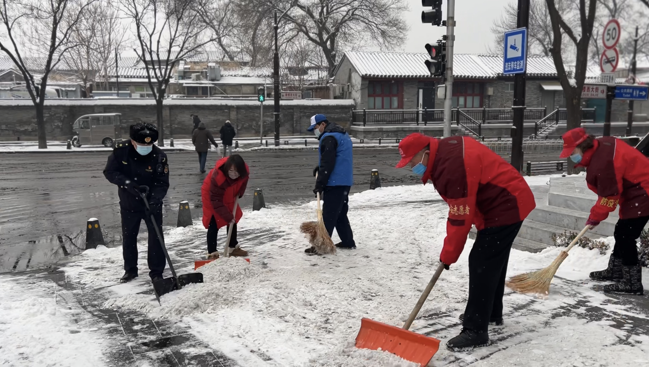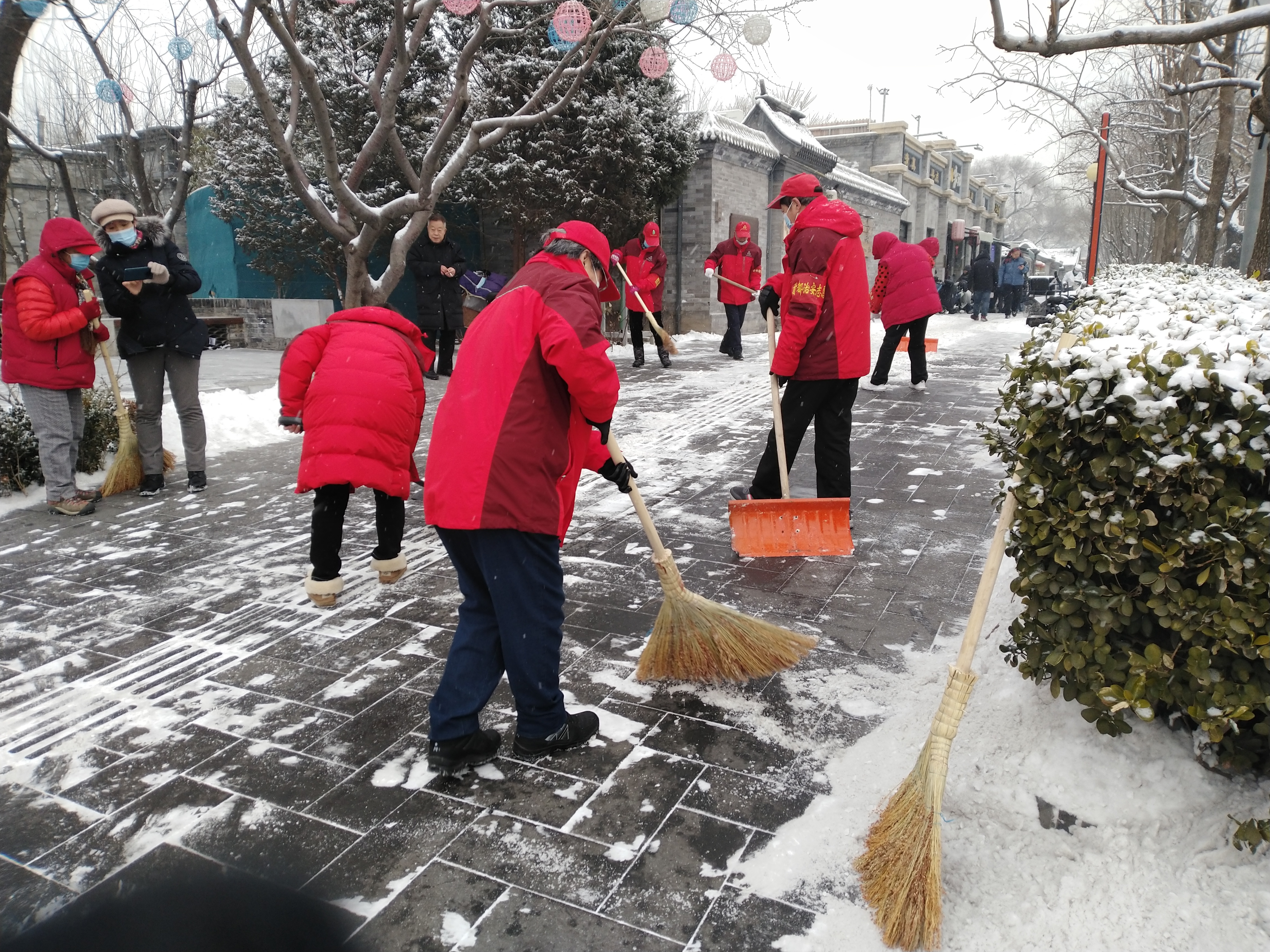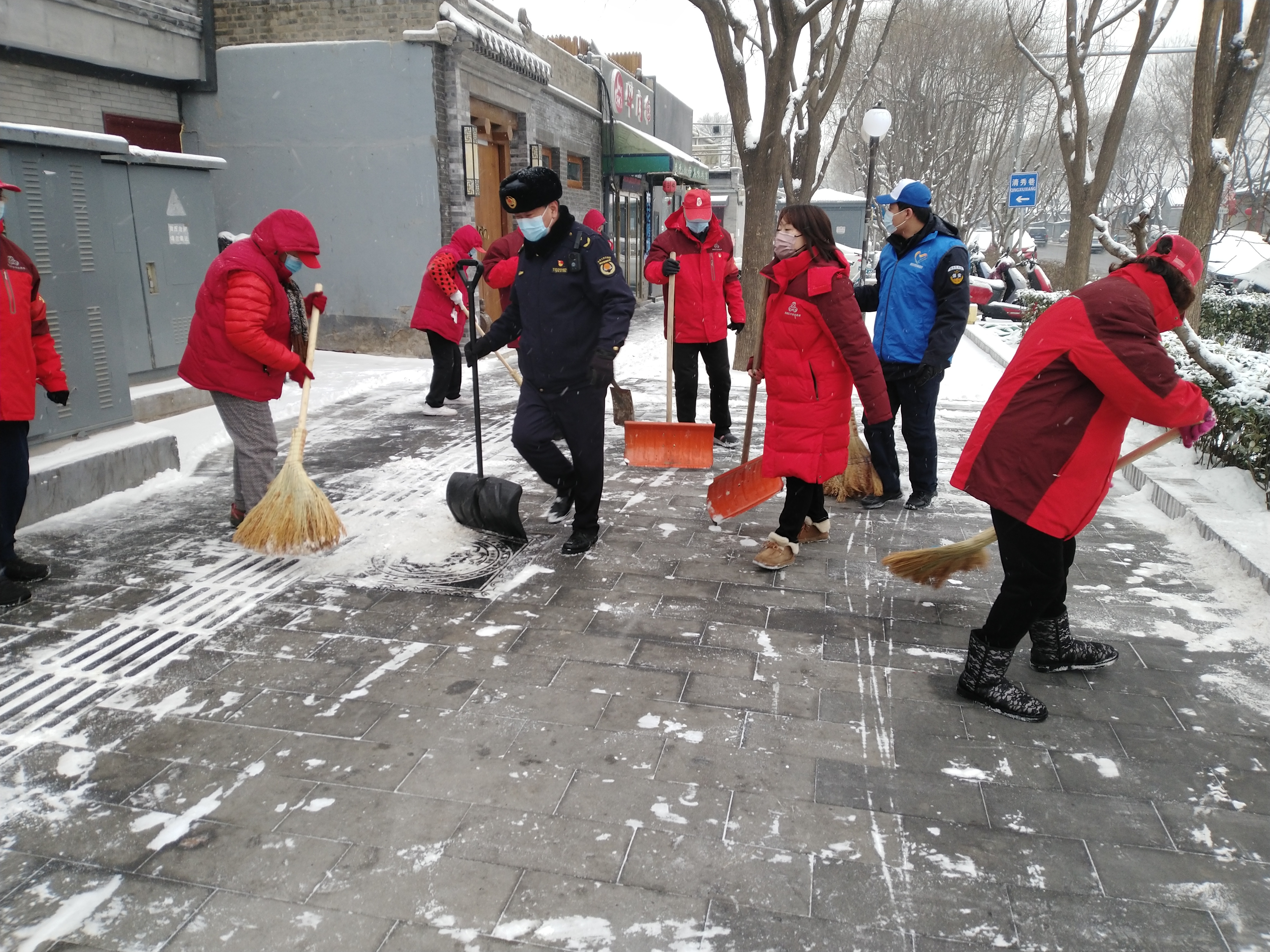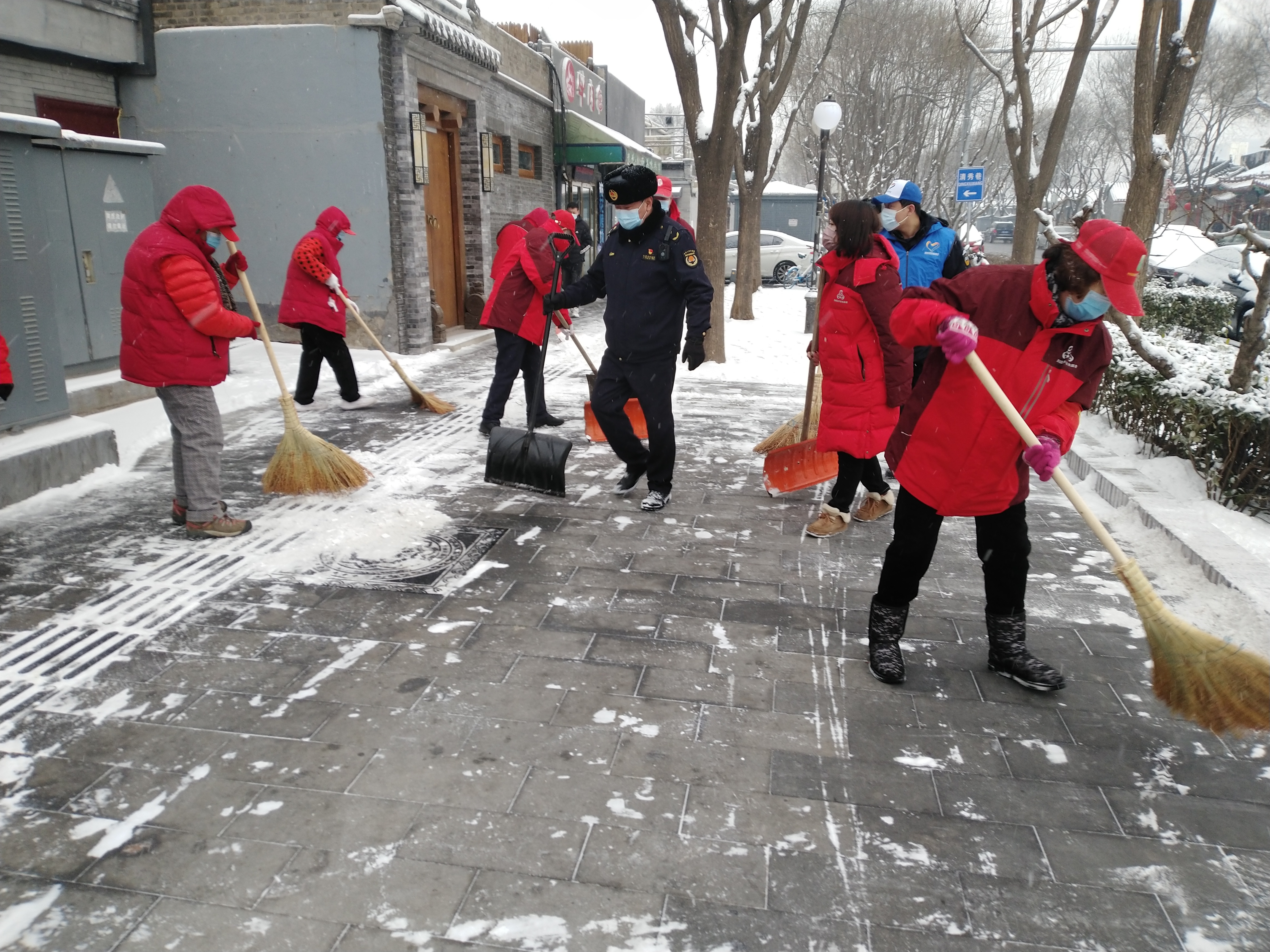 北京市民一直有个优良传统就是自雪门前雪,昨晚下了一夜的雪,市区大街小巷都铺上了厚厚的积雪,这让出行的市民几乎难以辨认真正的道路在哪里,为了给出行的居民提供安全,旧鼓楼大街的胡同居民一早就行动起来,与什刹海城管综合执法一队的队员清扫无人管理区域的积雪。
