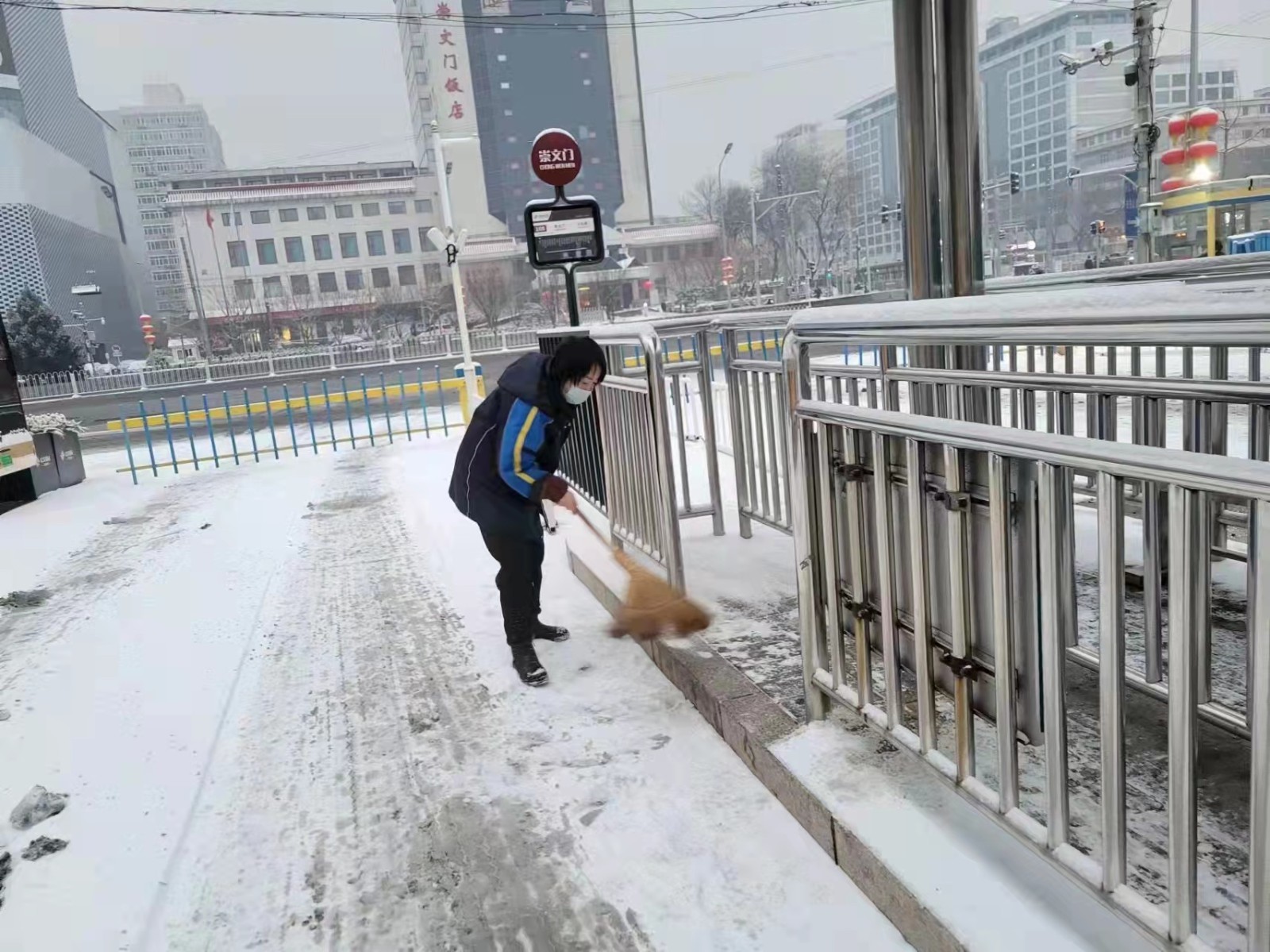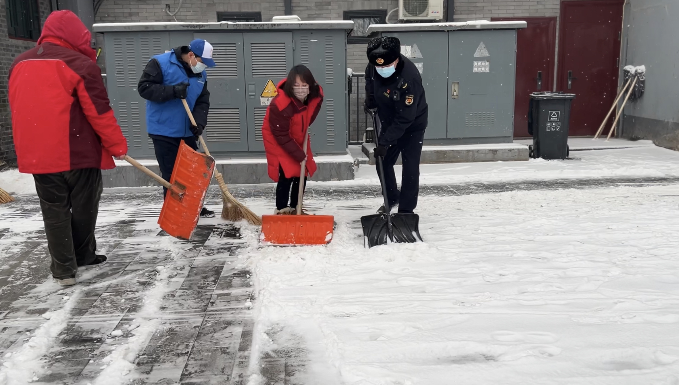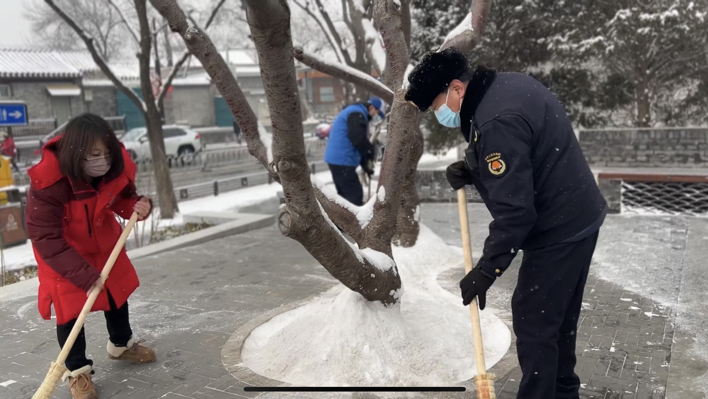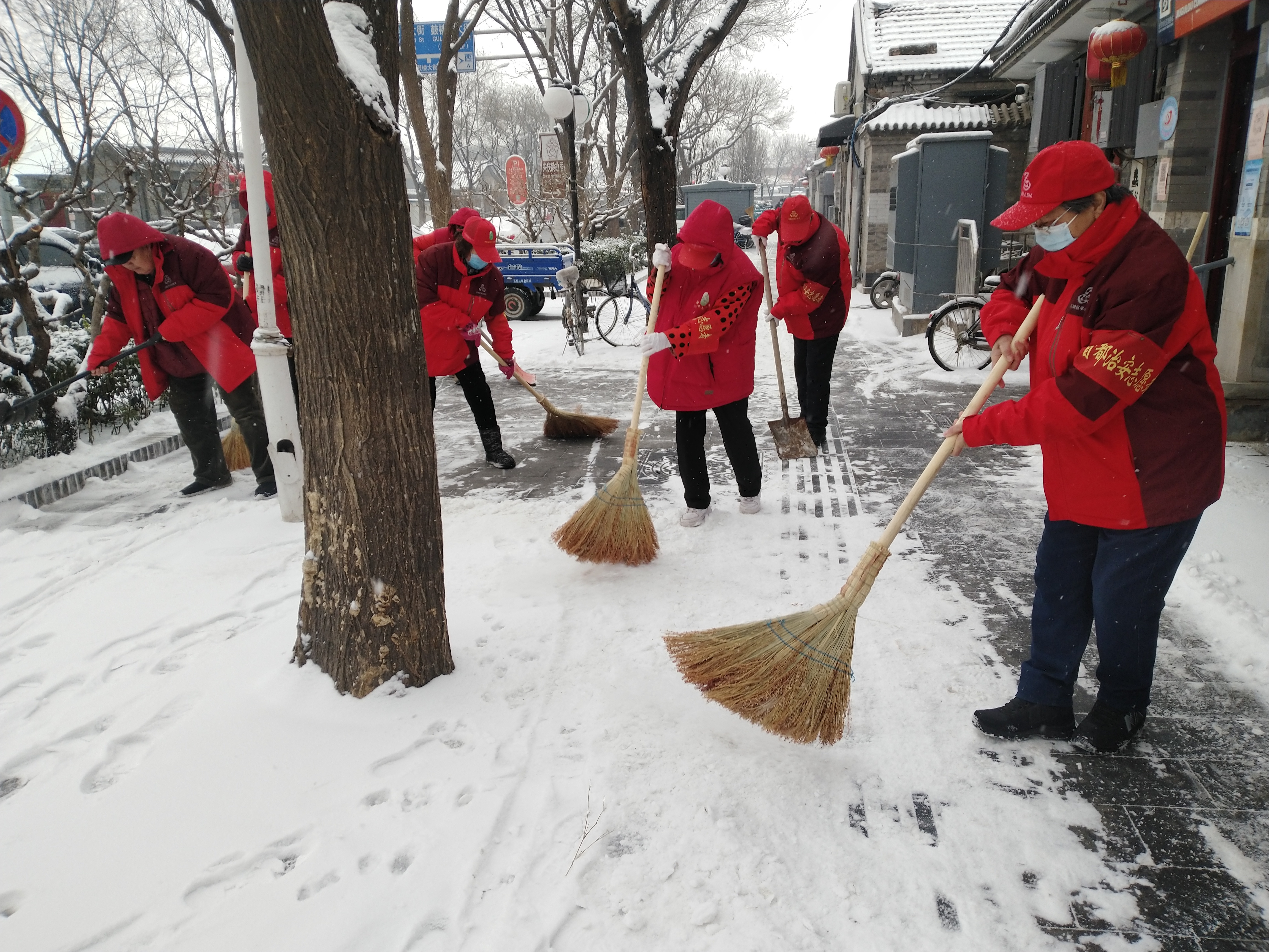 北京市民一直有个优良传统就是自雪门前雪,昨晚下了一夜的雪,市区大街小巷都铺上了厚厚的积雪,这让出行的市民几乎难以辨认真正的道路在哪里,为了给出行的居民提供安全,旧鼓楼大街的胡同居民一早就行动起来,与什刹海城管综合执法一队的队员清扫无人管理区域的积雪。