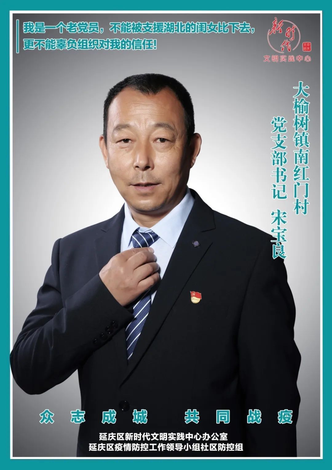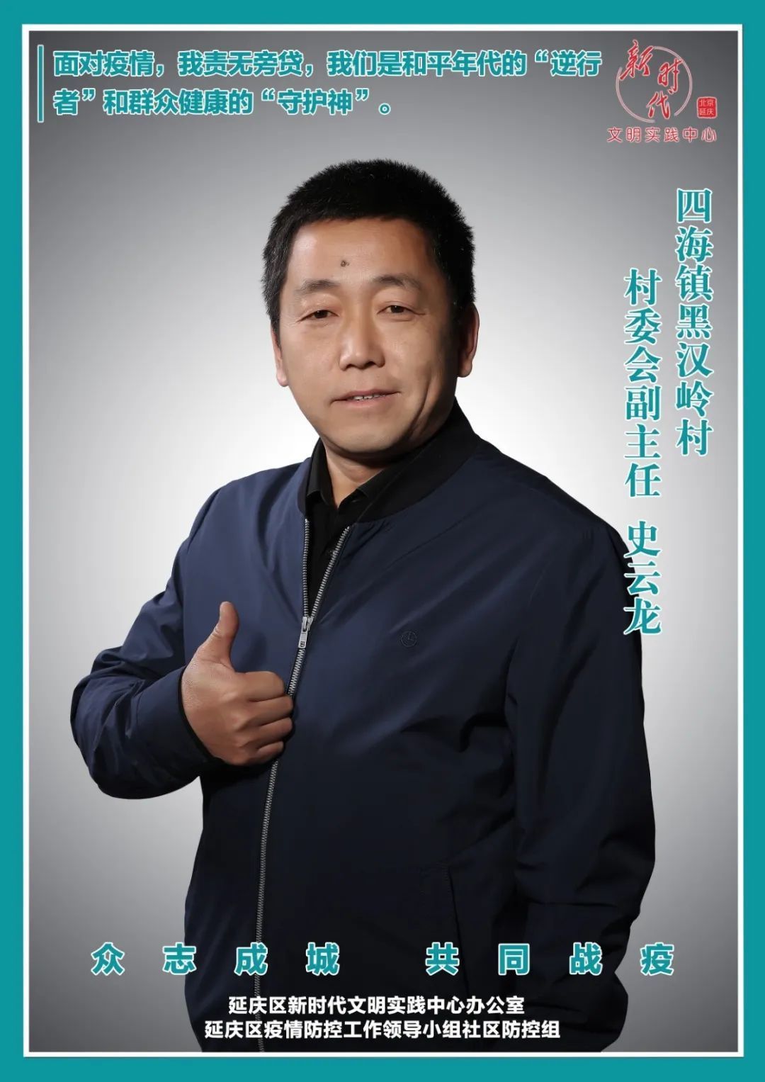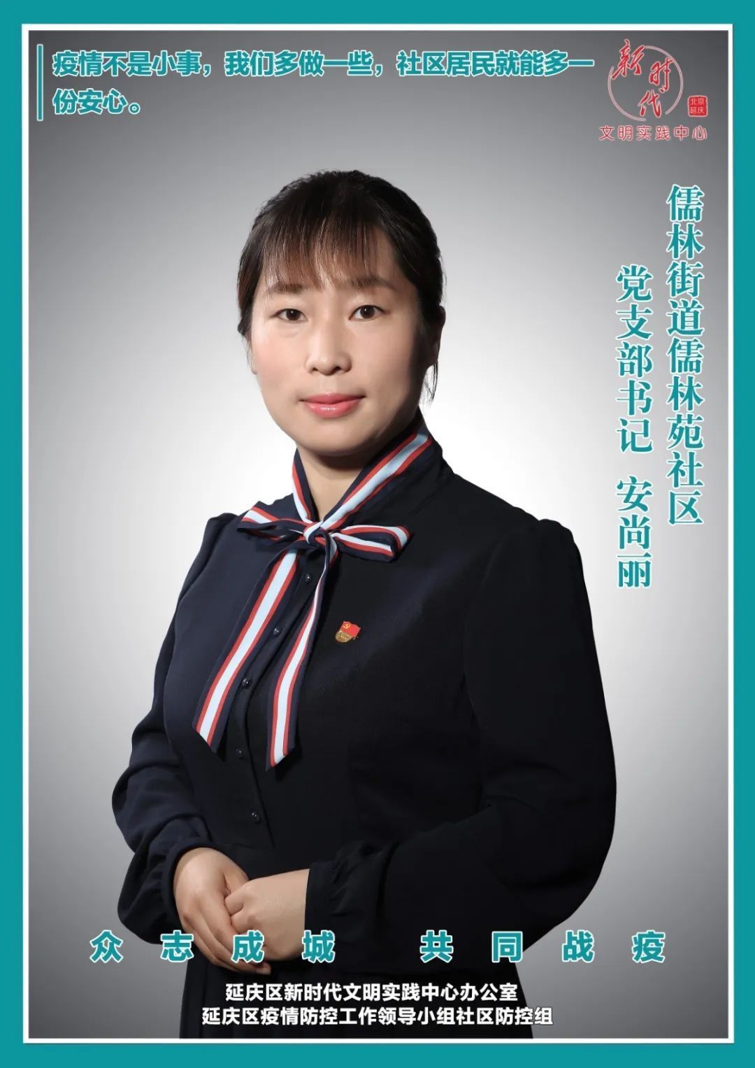 面对新冠肺炎疫情,延庆区强化党建引领,夯实四方责任,充分发挥各级党组织统筹协调作用,多措并举把社区(村)防控工作做稳、做细、做实,让党旗高高飘扬在战“疫”一线,合力构筑社区(村)防控铜墙铁壁。延庆区新时代文明实践中心办公室、延庆区疫情防控工作领导小组社区防控组推出#抗疫英雄谱——最美家园守护者#系列人物盘点,邀请他们来到聚光灯下,拍一组照片,用图像记录感动。